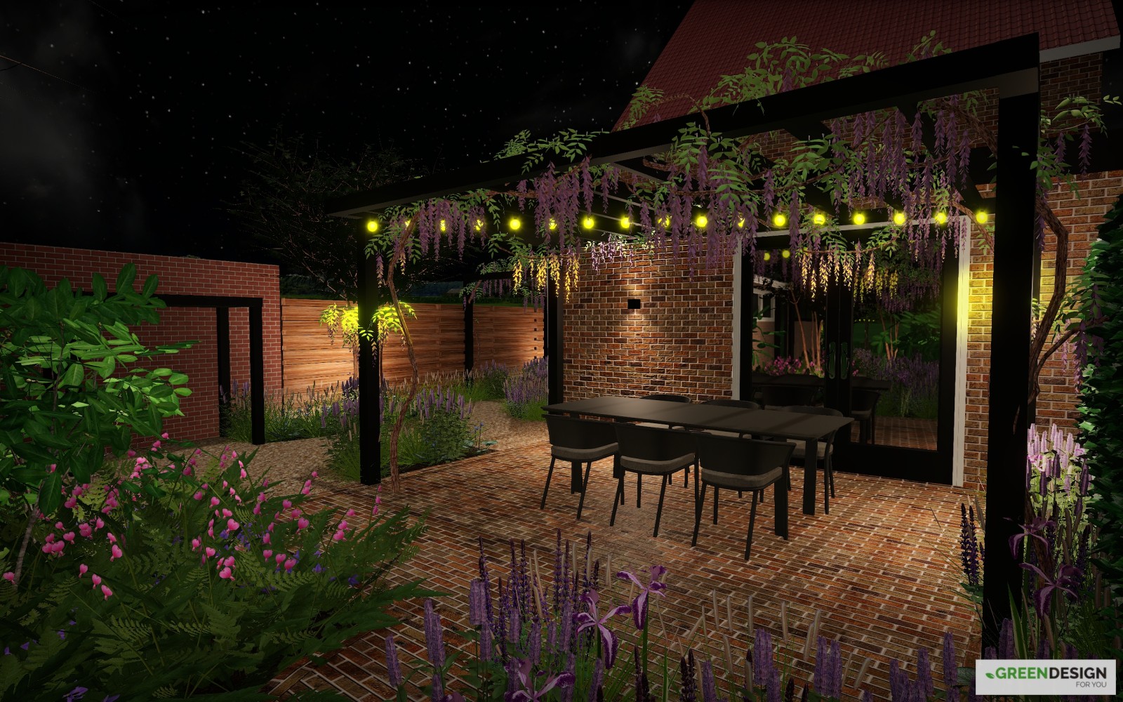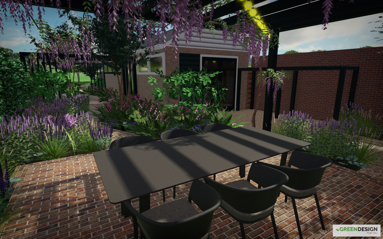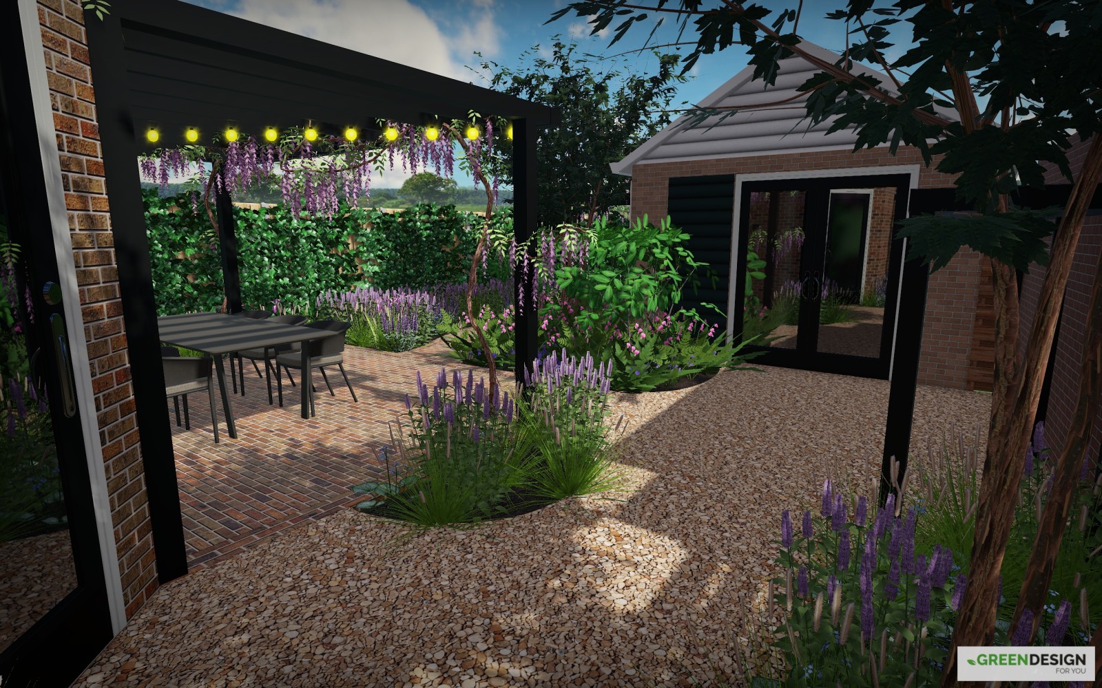 Omdat de tuin een enorme diepte heeft, hebben we gekozen voor een speelse zichtlijn die de blik als vanzelf het landschap in trekt. Dicht bij de woning begint het ontwerp met comfort: een royaal terras, overdekt door een pergola waar blauweregen straks weelderig overheen groeit. Vanuit dit vertrekpunt ontvouwt de tuin zich verder in vloeiende lijnen en subtiele structuren.