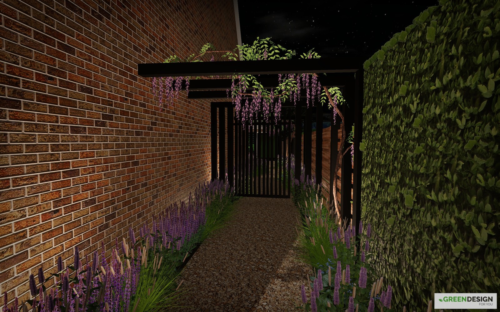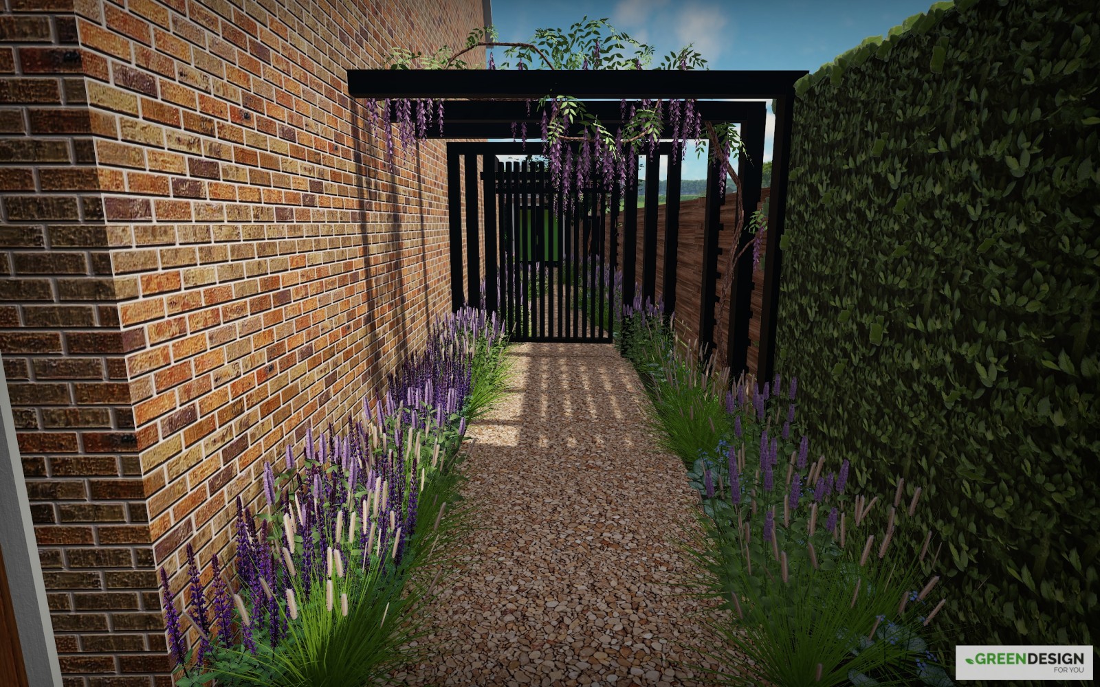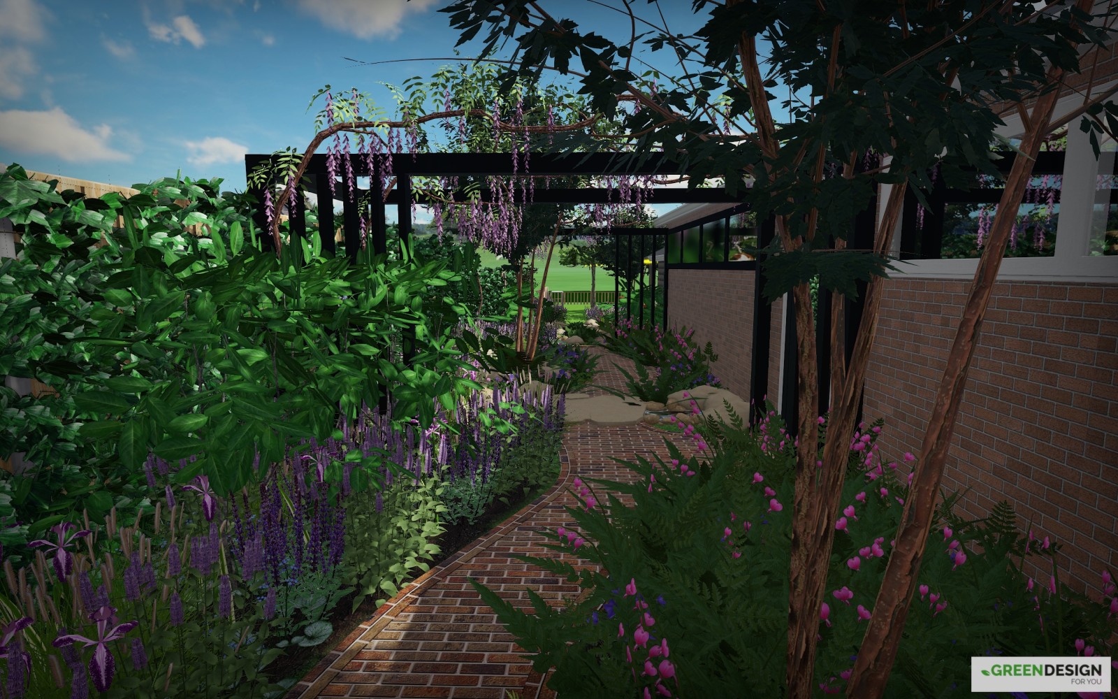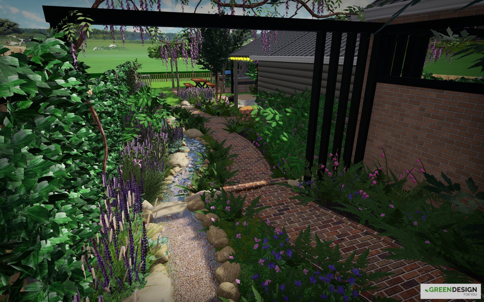 Omdat de tuin een enorme diepte heeft, hebben we gekozen voor een speelse zichtlijn die de blik als vanzelf het landschap in trekt. Dicht bij de woning begint het ontwerp met comfort: een royaal terras, overdekt door een pergola waar blauweregen straks weelderig overheen groeit. Vanuit dit vertrekpunt ontvouwt de tuin zich verder in vloeiende lijnen en subtiele structuren.