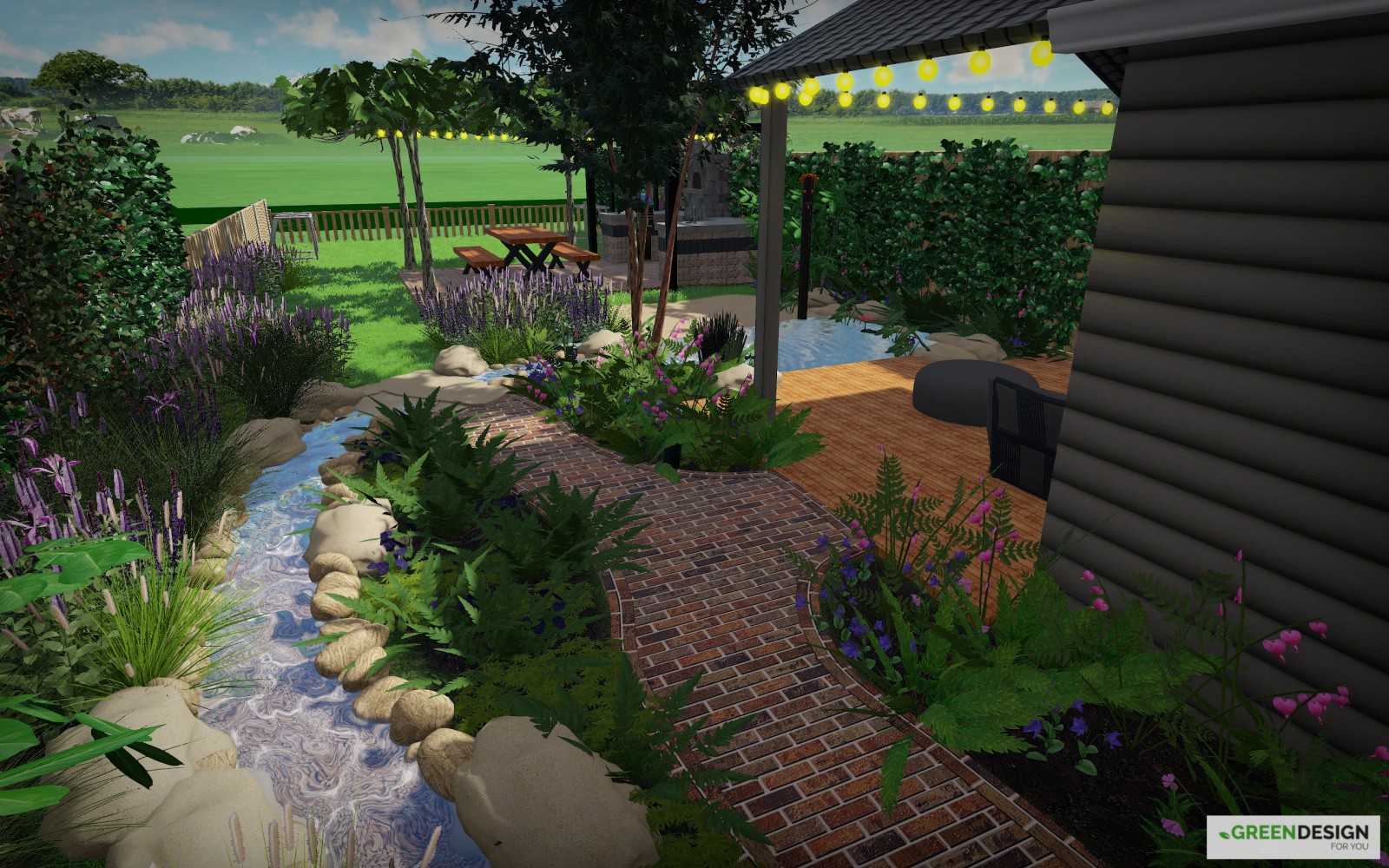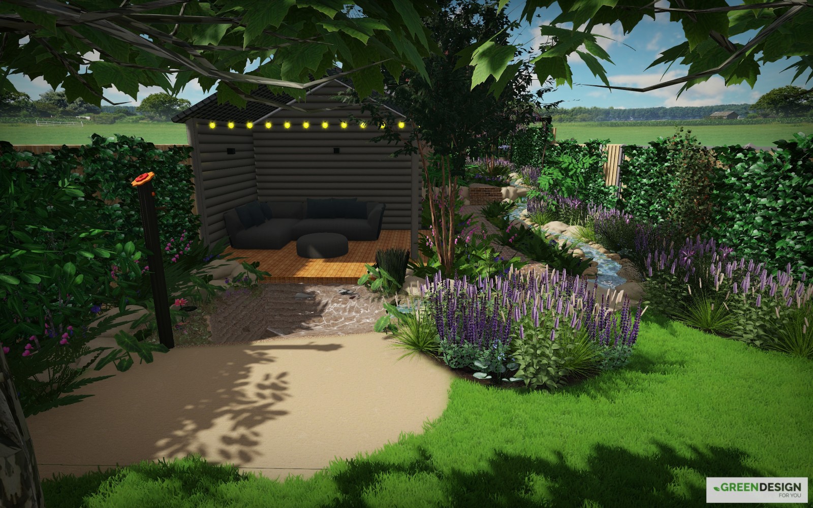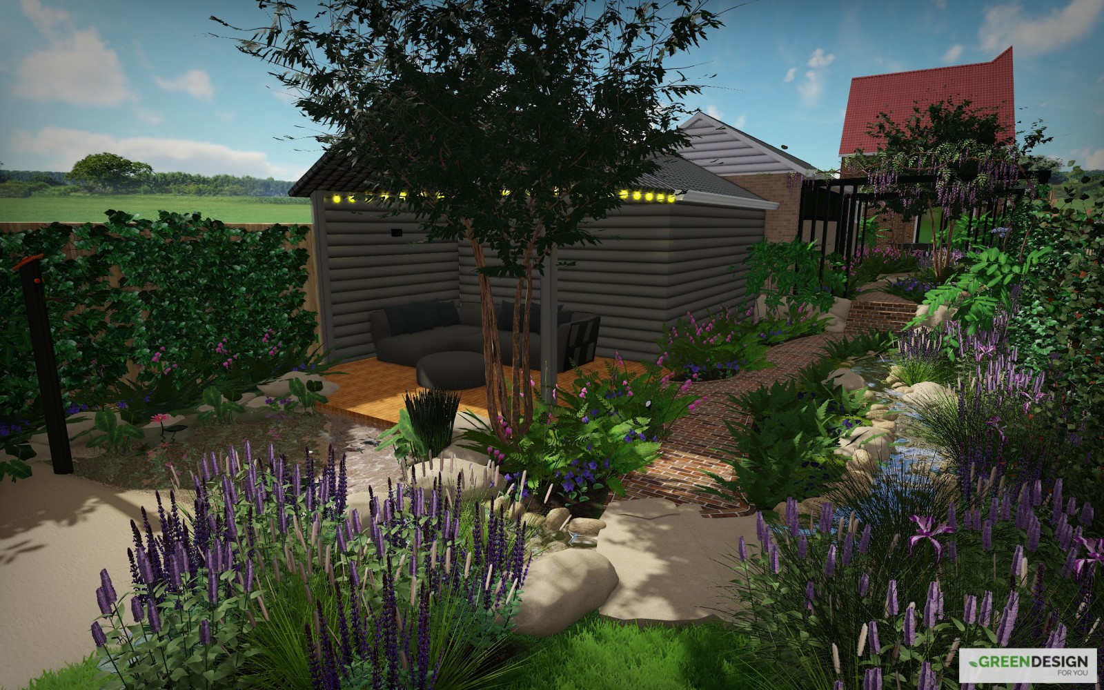 Langs een slingerpad loop je door een rijk bloeiende border naar een beekloop die de volgende tuinkamer inluidt. Het water slingert speels met het pad mee en eindigt bij een veranda met een unieke speelvijver en een zandstrandje. Kinderen kunnen hier naar hartenlust dammetjes bouwen, afkoelen of zandkastelen maken, terwijl het waterontwerp ook esthetisch een verrijking vormt voor de tuin.