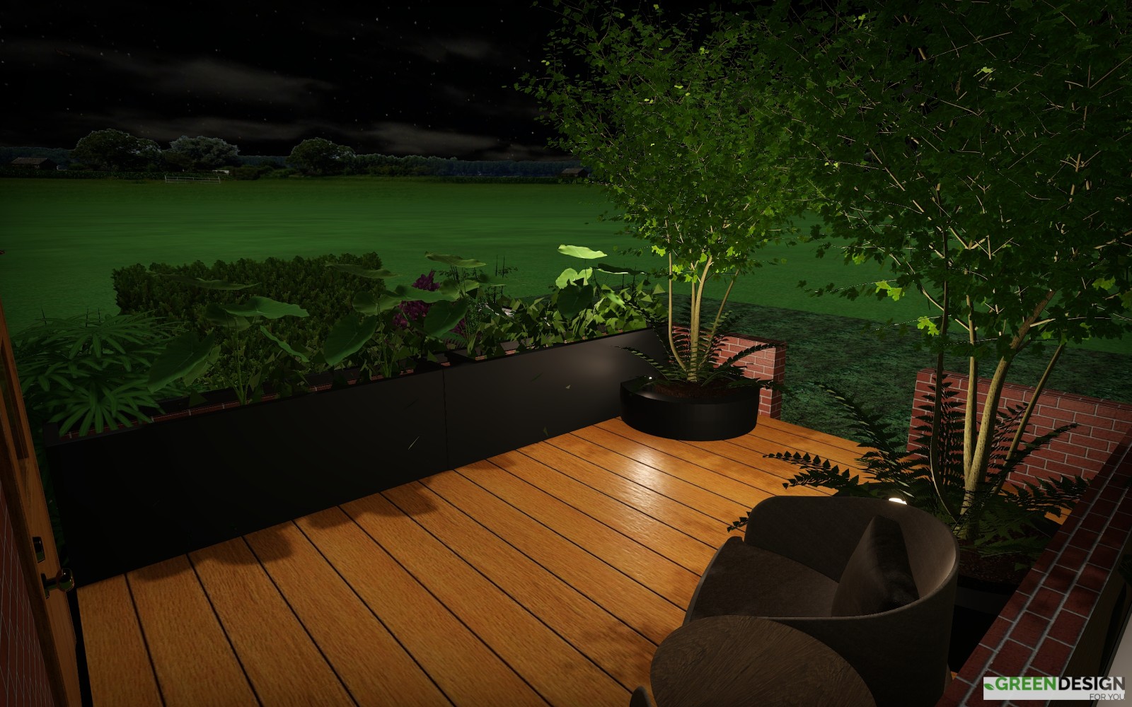 ‘s Avonds verandert de tuin in een magische en intieme buitenruimte. Strategisch geplaatste verlichting accentueert het volwassen groen, de houten vlonder en het zitje. Zo blijft de tuin ook na zonsondergang een uitnodigende plek waar bewoners kunnen ontspannen, genieten of samenkomen met vrienden.