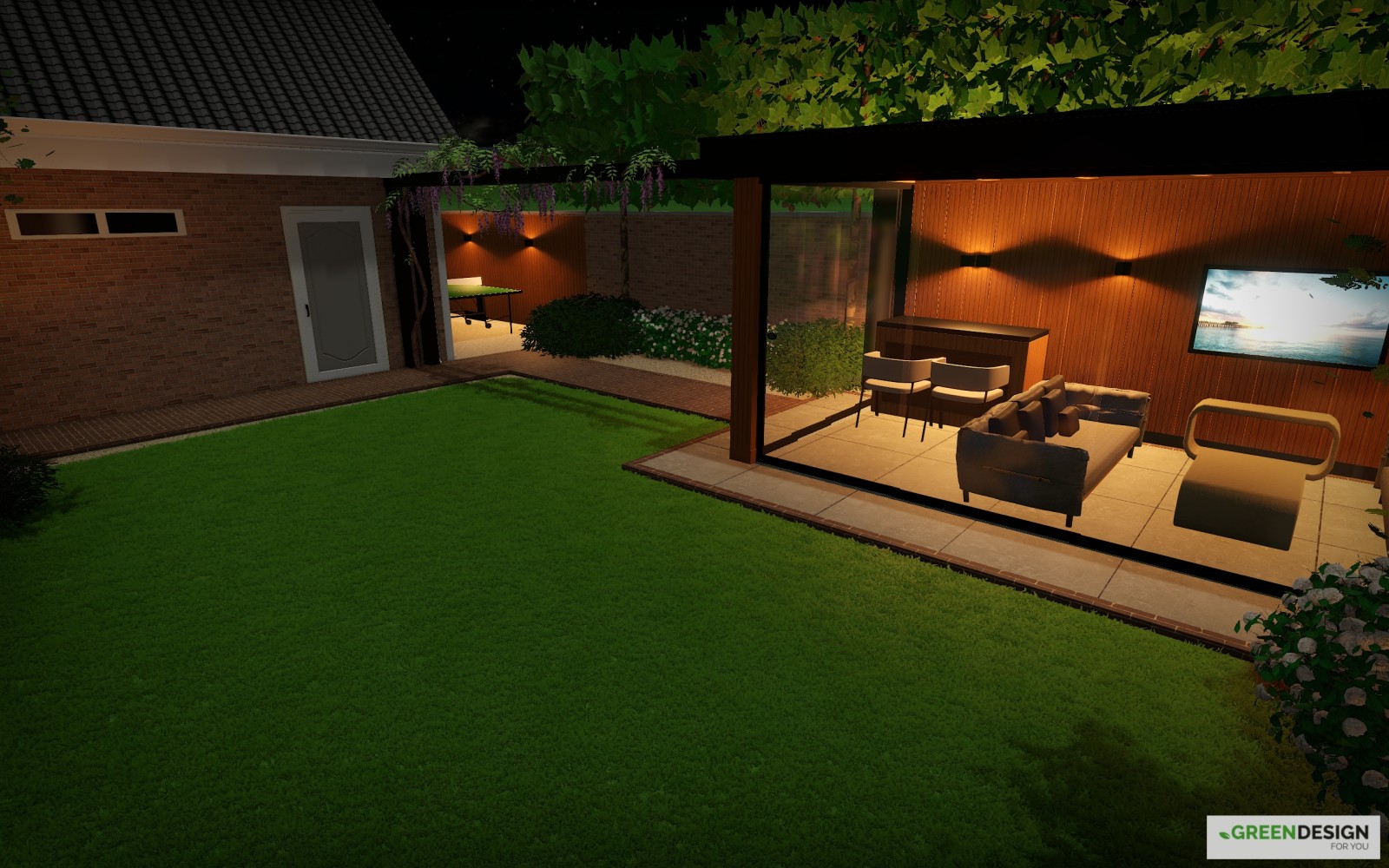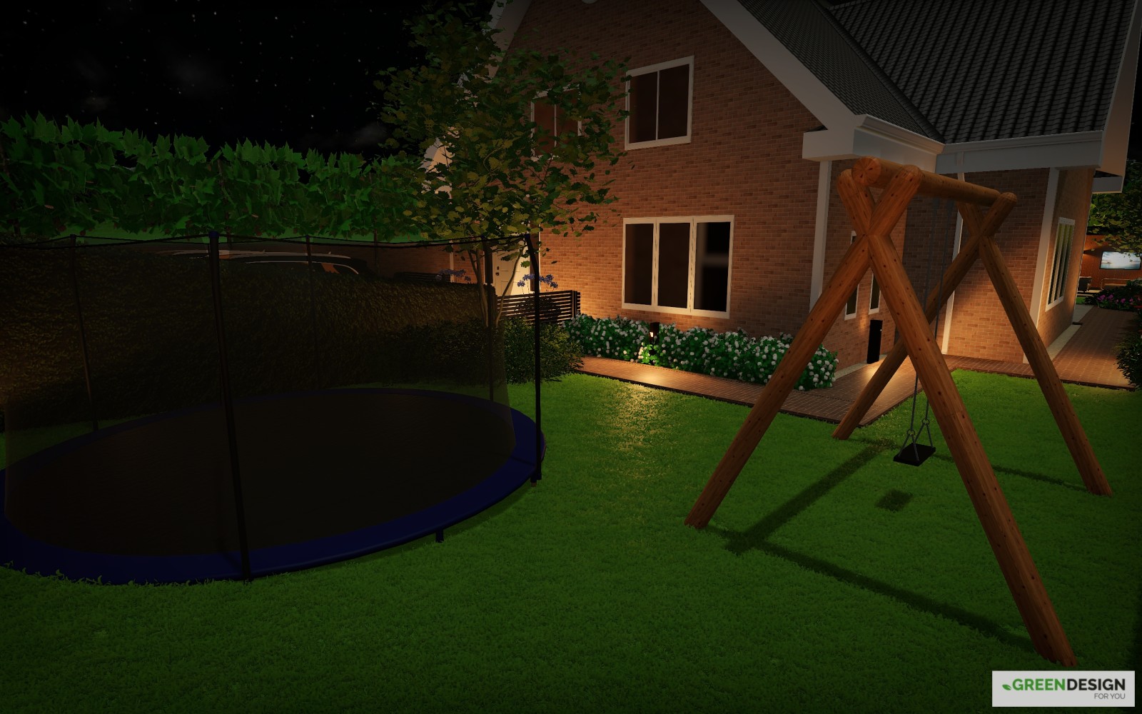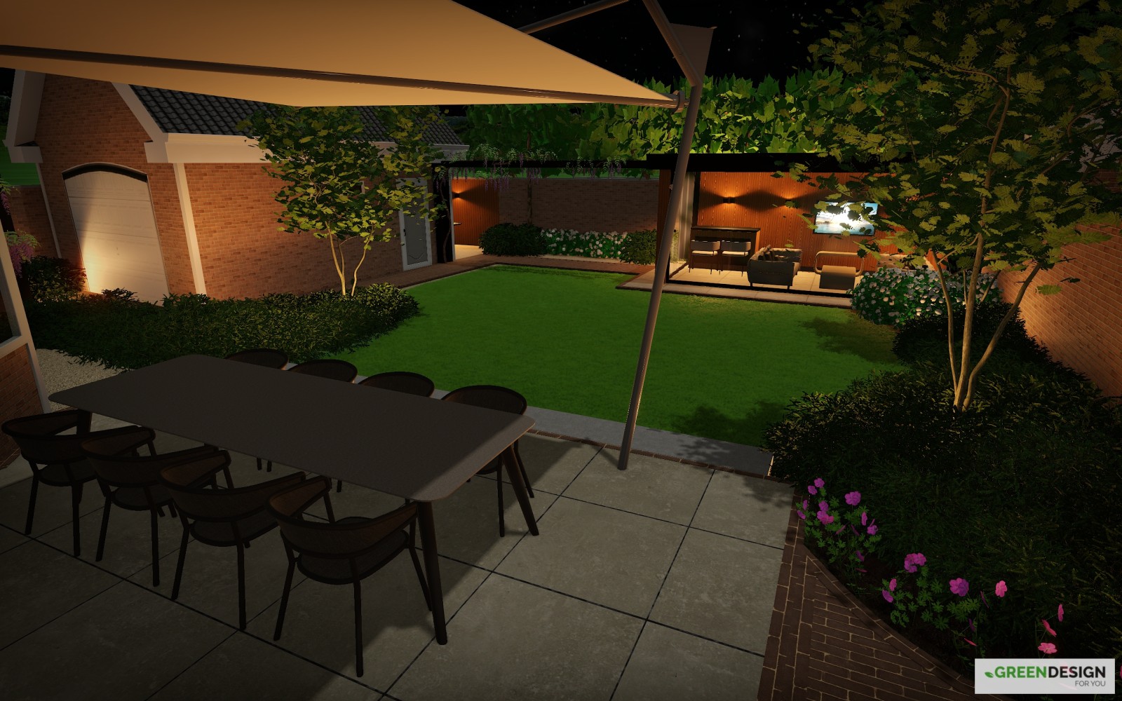 ’s Avonds verandert de tuin in een betoverend buitenverblijf. Strategisch geplaatste verlichting accentueert bomen, wanden en opstapjes, waardoor een warme en intieme ambiance ontstaat. Dit maakt de tuin niet alleen praktisch bruikbaar in het donker, maar voegt ook een extra belevingswaarde toe die iedere avond bijzonder maakt.
