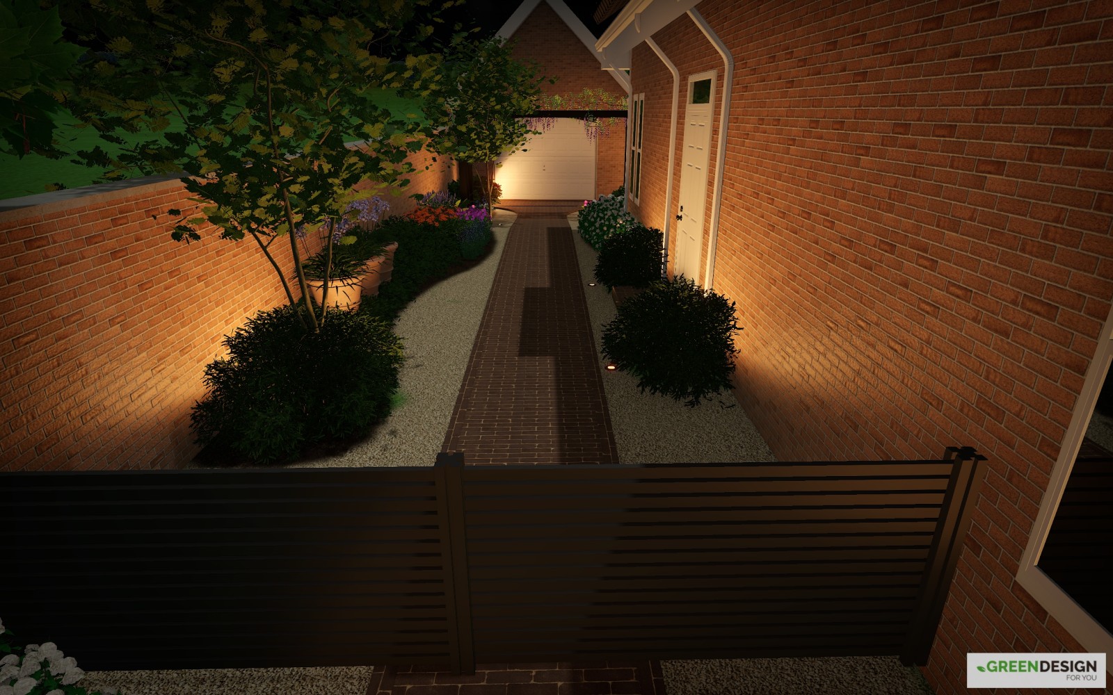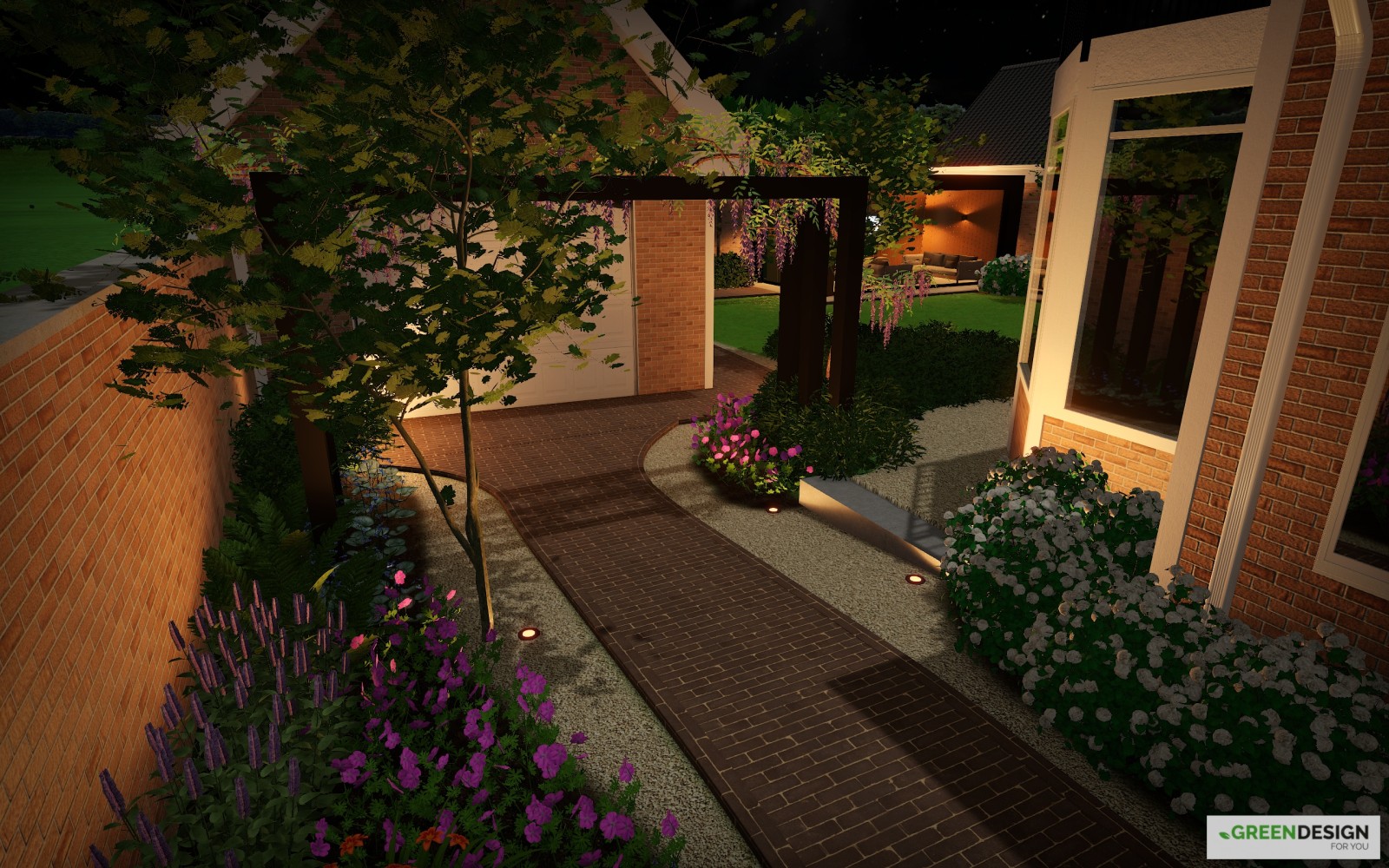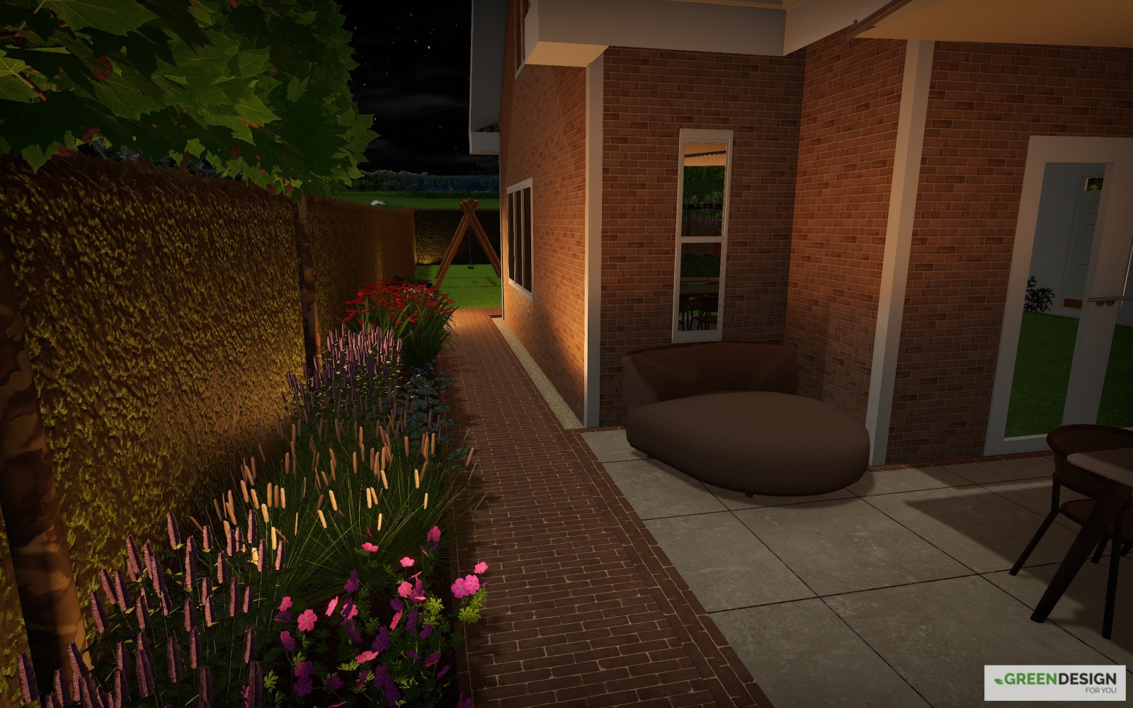 ’s Avonds verandert de tuin in een betoverend buitenverblijf. Strategisch geplaatste verlichting accentueert bomen, wanden en opstapjes, waardoor een warme en intieme ambiance ontstaat. Dit maakt de tuin niet alleen praktisch bruikbaar in het donker, maar voegt ook een extra belevingswaarde toe die iedere avond bijzonder maakt.