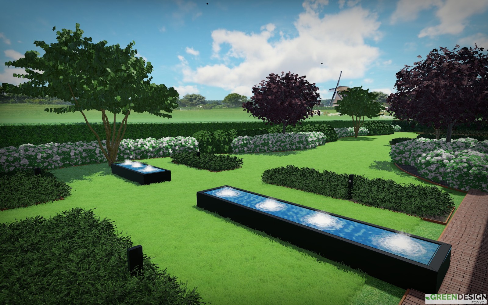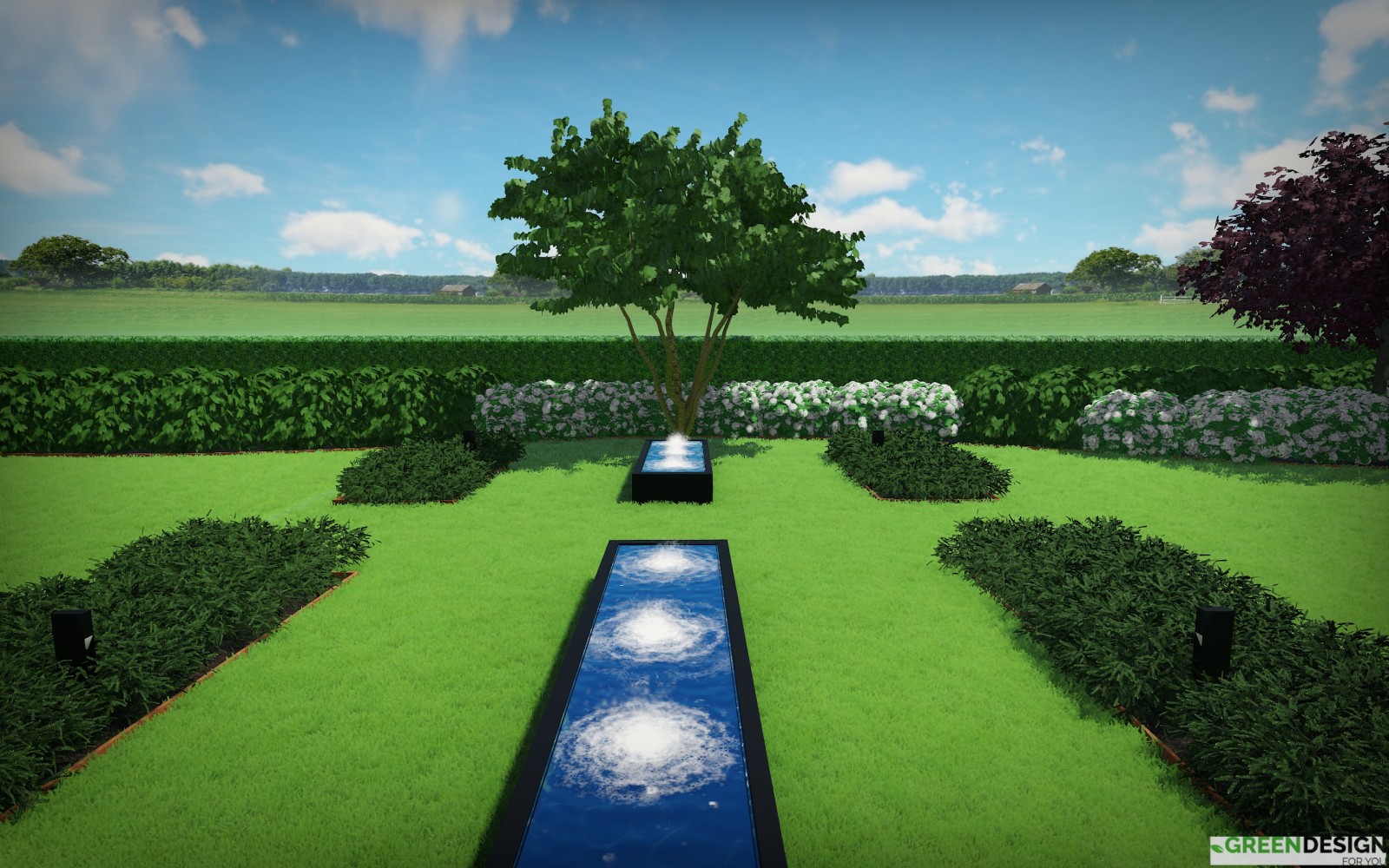 Water speelt een essentiële rol in dit ontwerp. Strakke watertafels creëren een subtiel, levendig element dat niet alleen visueel aantrekkelijk is, maar ook een rustgevend geluid met zich meebrengt. Het geluid van kabbelend water versterkt het gevoel van ontspanning en harmonie. De watertafels voegen een extra dimensie toe aan de tuin, terwijl ze tegelijkertijd het ontwerp verfijnen met hun geometrische vormen en reflecterende oppervlakken.