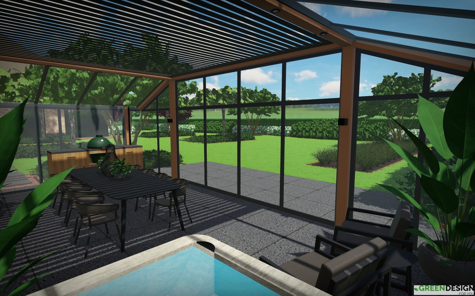 Een belangrijk kenmerk van deze tuin is de strakke en stijlvolle aanbouw van glas in combinatie met hout. Grote glazen wanden openen de ruimte naar de tuin en brengen het buitenleven naar binnen. De transparantie van het glas zorgt voor een maximale lichtinval en laat de tuin als het ware binnenstromen, waardoor je het gevoel hebt de natuur in huis te halen.