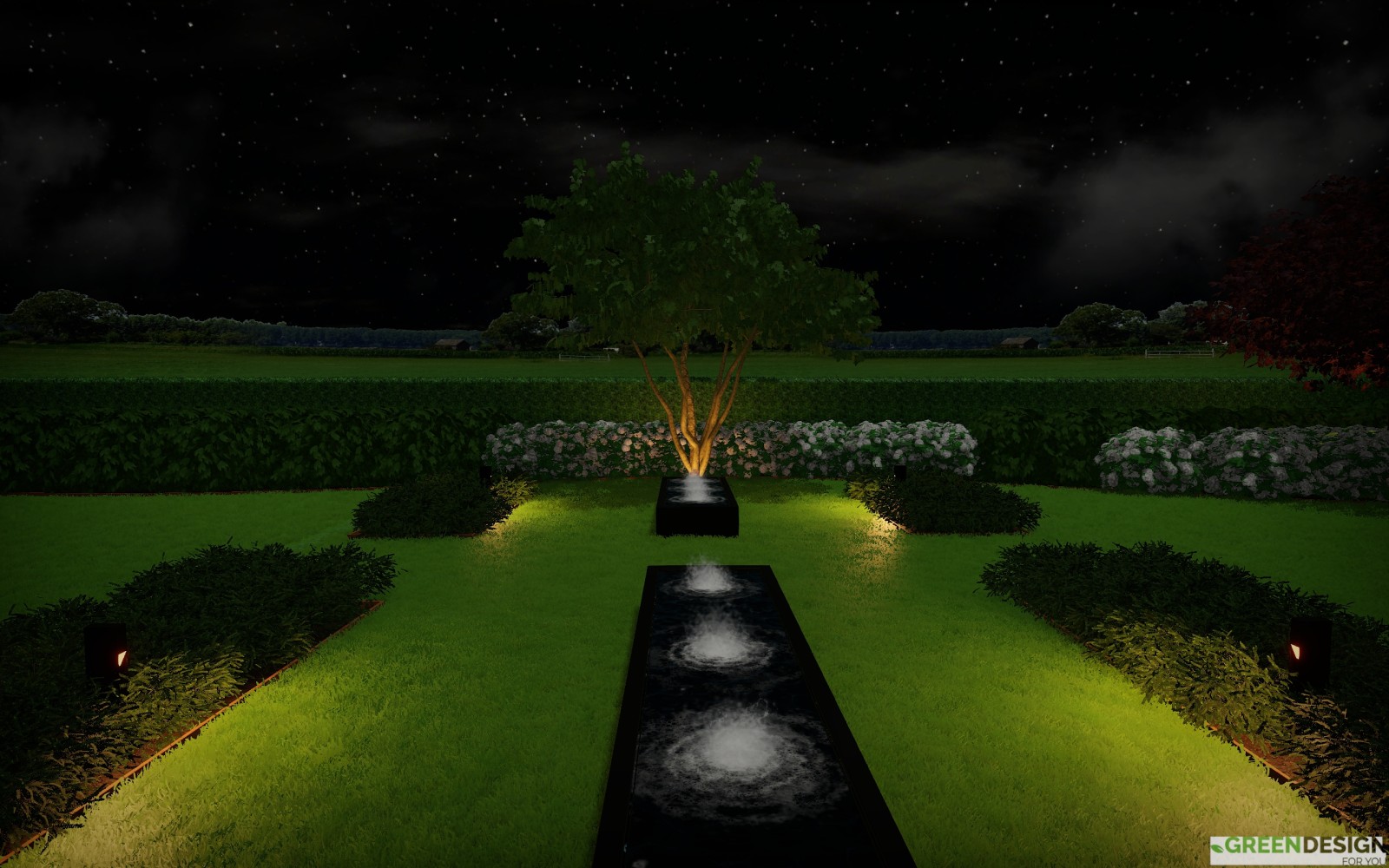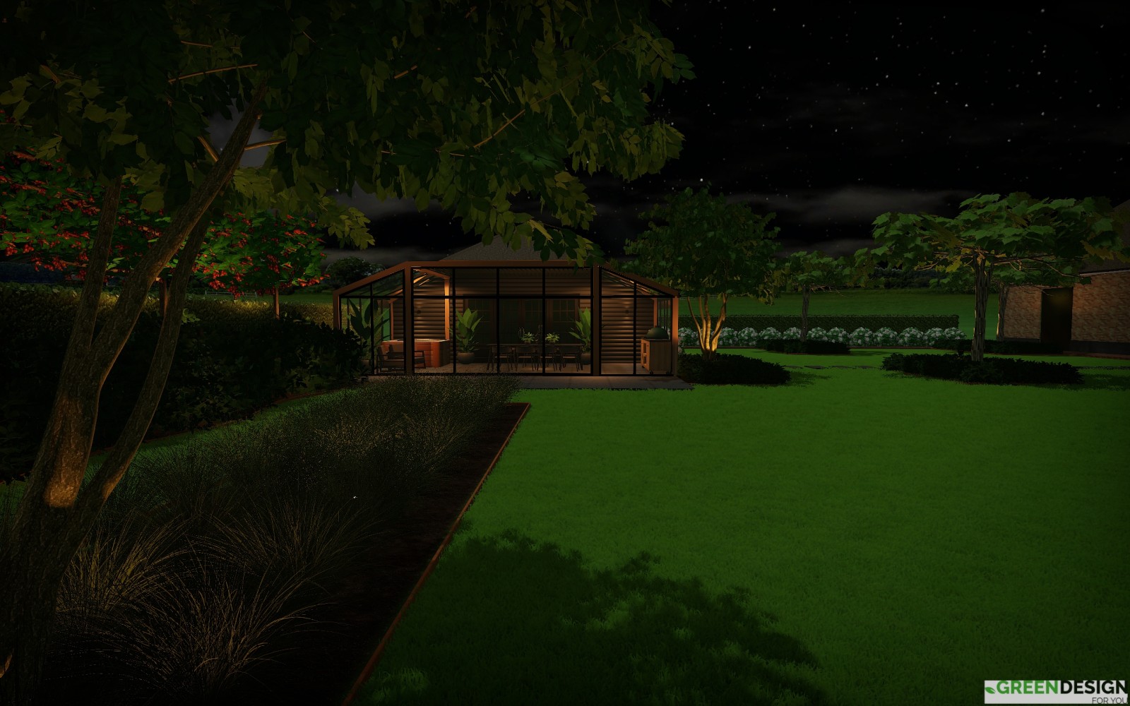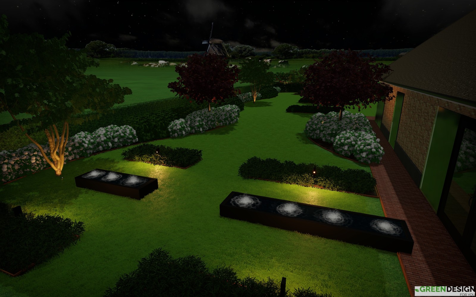 Wanneer de zon ondergaat, verandert de tuin in een magische setting dankzij de subtiele en sfeervolle verlichting. Zwoele lichten accentueren de groene structuren, de waterpartijen en de bijzondere bomen, waardoor de tuin een extra dimensie krijgt. De verlichting creëert diepte en charme, waardoor de tuin ook ‘s avonds een verlengstuk wordt van de woonkamer.