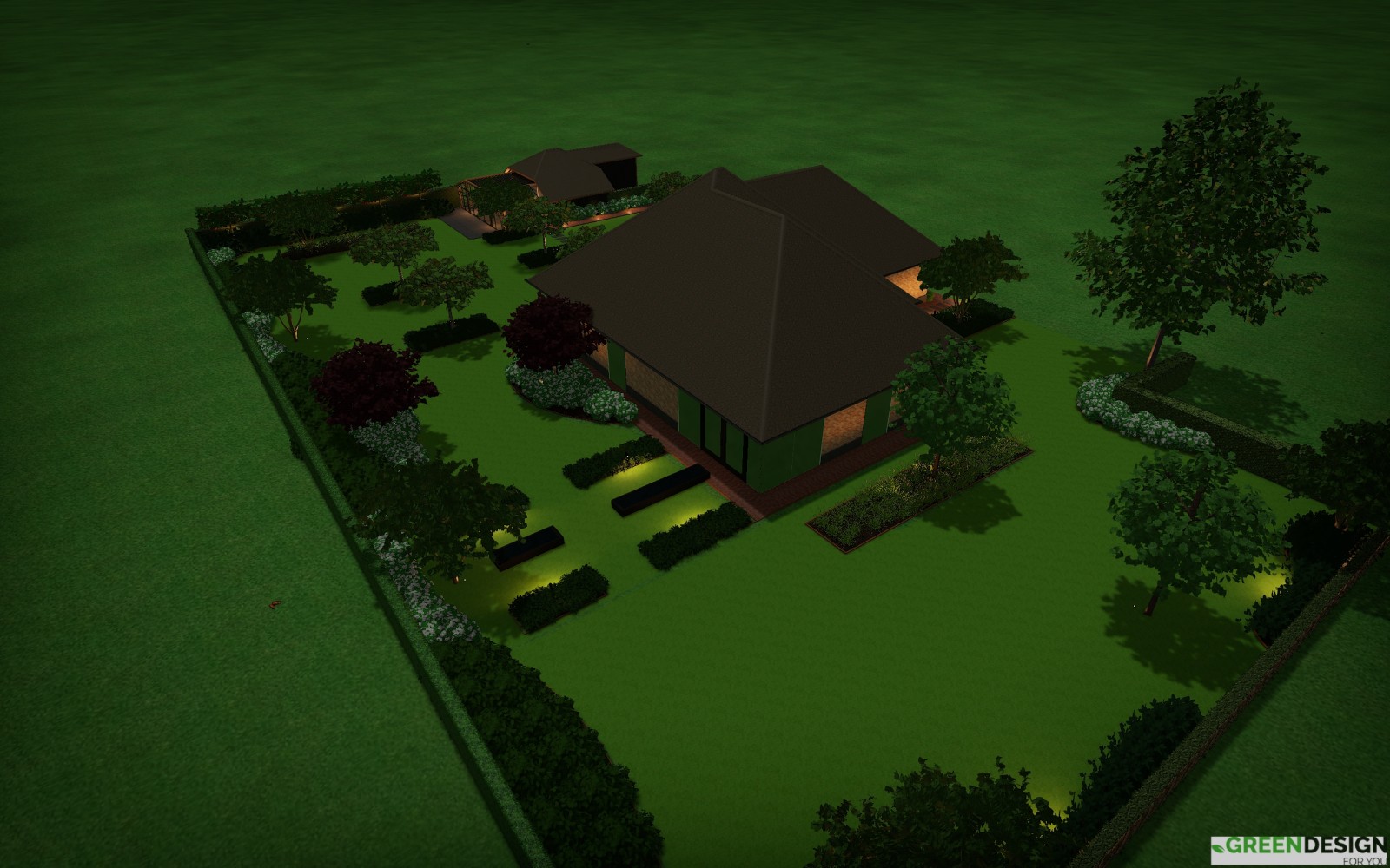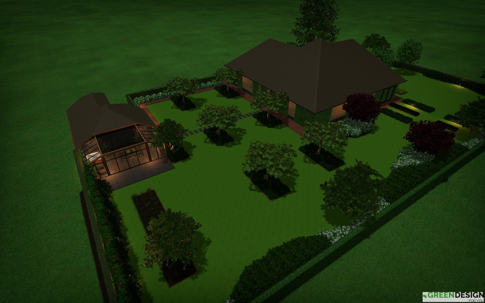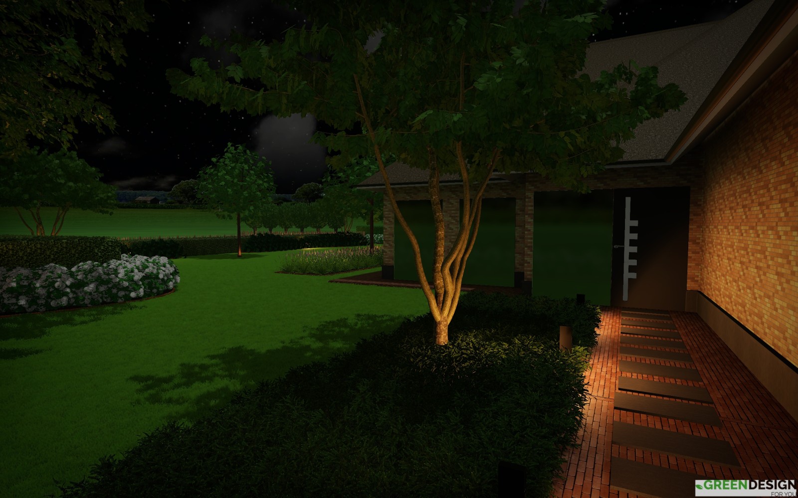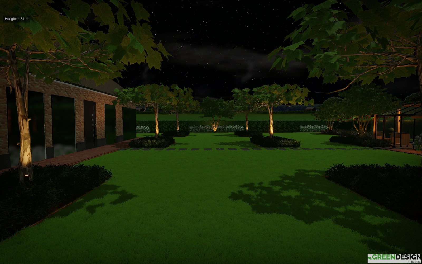 Wanneer de zon ondergaat, verandert de tuin in een magische setting dankzij de subtiele en sfeervolle verlichting. Zwoele lichten accentueren de groene structuren, de waterpartijen en de bijzondere bomen, waardoor de tuin een extra dimensie krijgt. De verlichting creëert diepte en charme, waardoor de tuin ook ‘s avonds een verlengstuk wordt van de woonkamer.