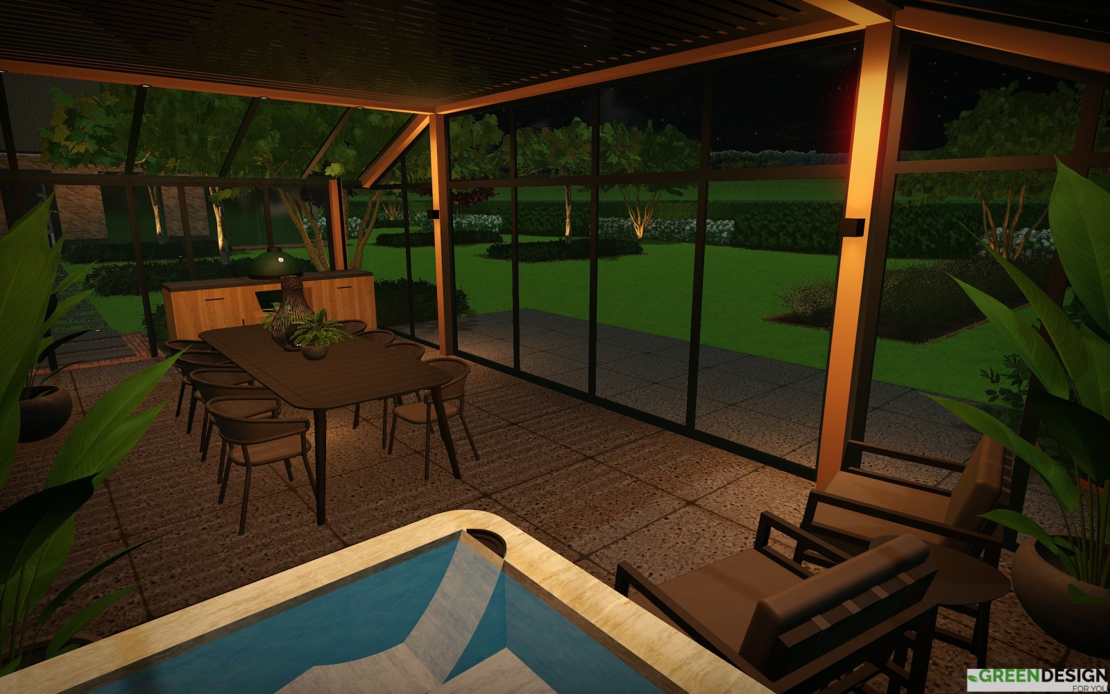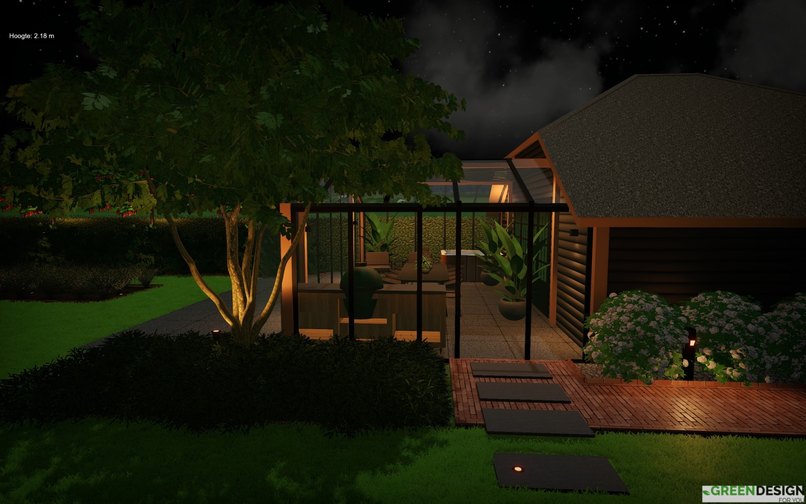 Het strategisch geplaatste licht benadrukt de architectonische elementen van de tuin, terwijl schaduwen en reflecties een intieme en romantische sfeer oproepen. Deze verlichting maakt de tuin een plek voor gezellige avonden, of je nu dineert met vrienden, een boek leest in de buitenlucht, of gewoon geniet van de rustige avondlucht.