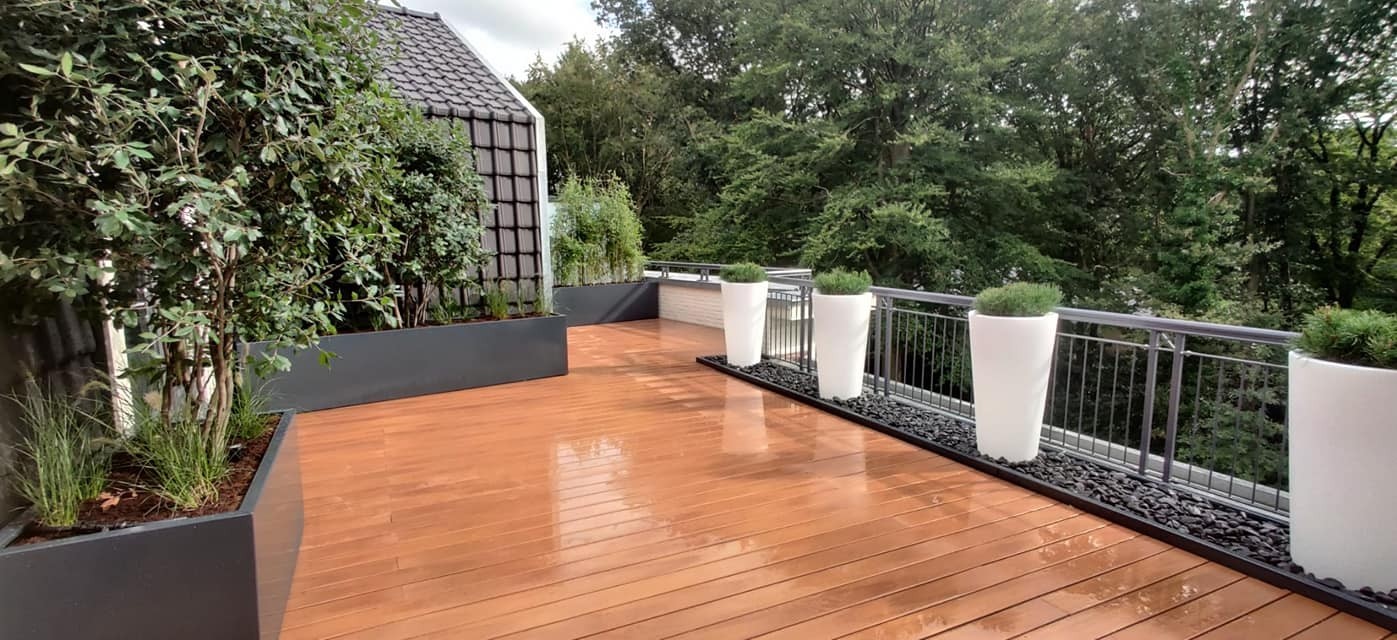 Als we kijken naar het materiaalgebruik is er gegaan voor het beste. Een composiet vlonder dient als basis voor het terras. Door de warme uitstraling zorgt hij voor sfeer. Blind bevestigd, duurzaam en voor de lange termijn.