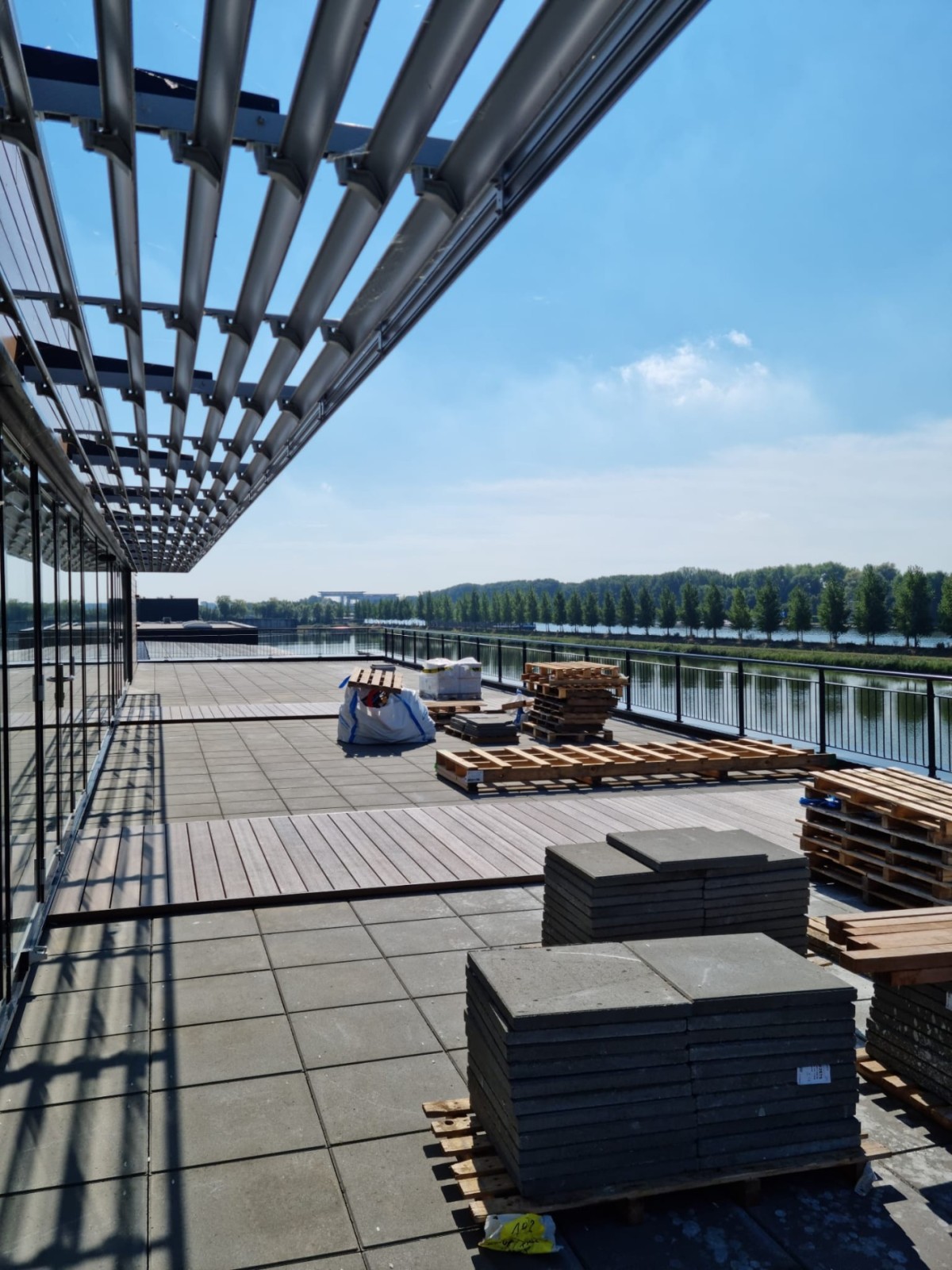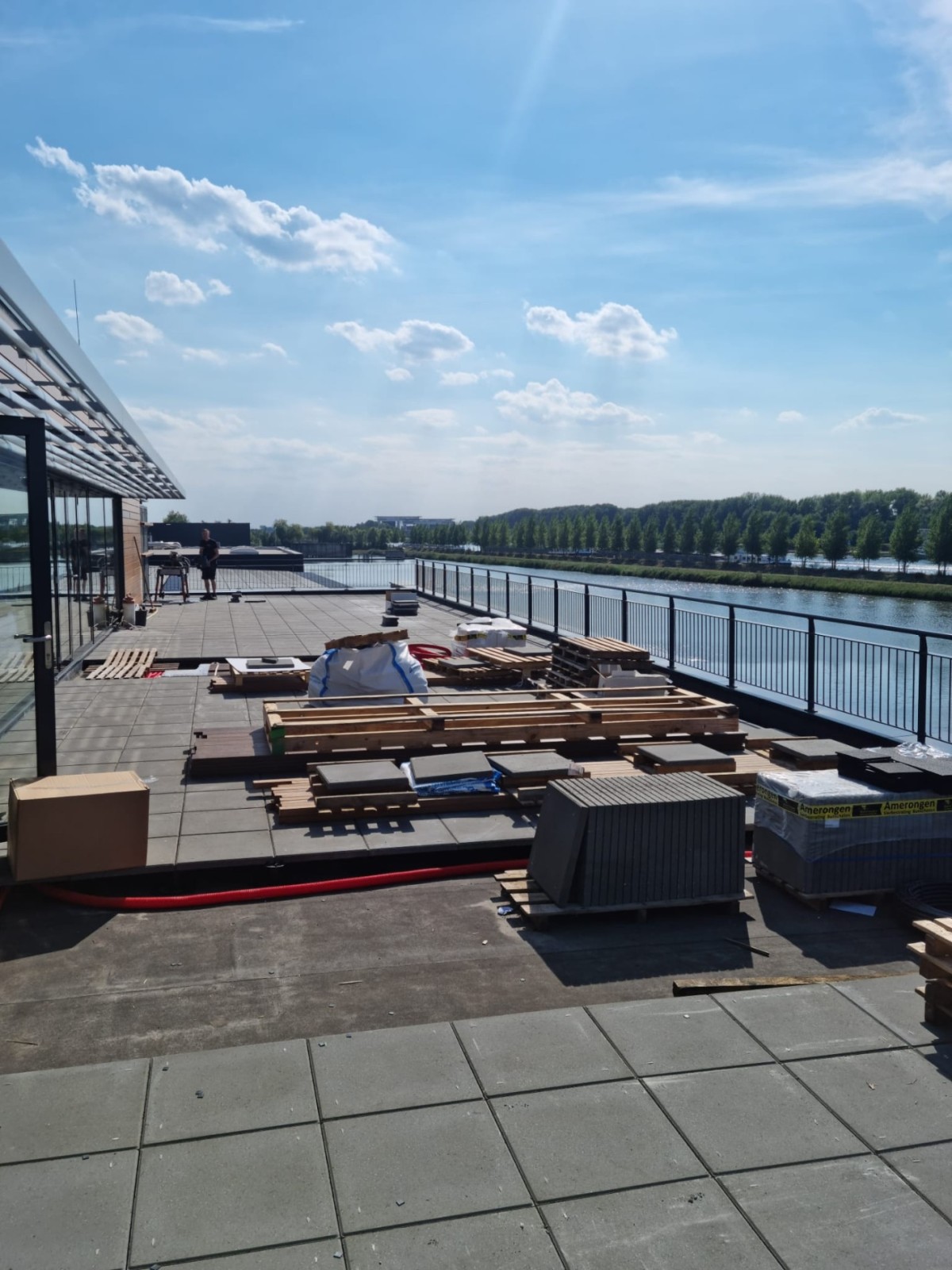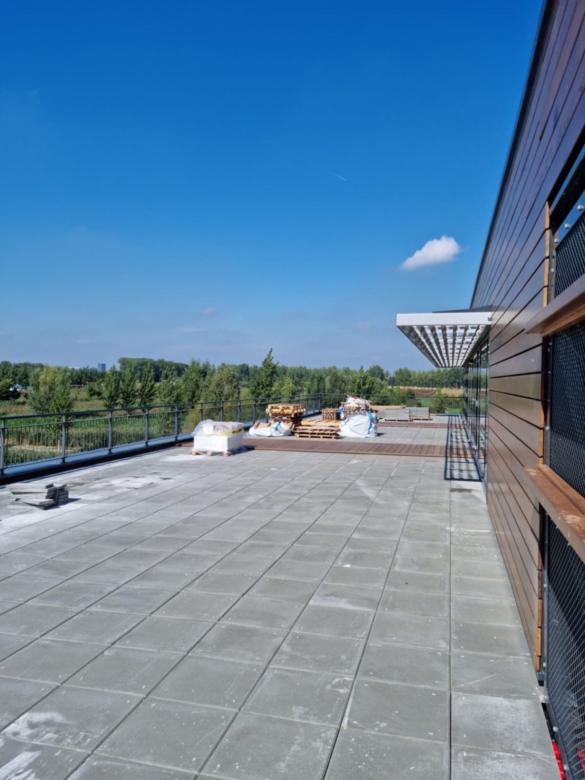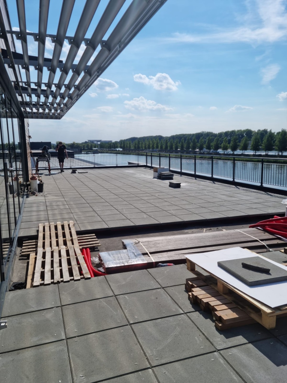 De opbouw bestaat uit verstelbare tegeldragers met betontegels die netjes aansluiten op de instap hoogte van het terras. Bij de entree's van het dakterras is gebruik gemaakt van composiet vlonders van fiberon. De planken zijn niet alleen duurzaam, maar de warme tinten sluiten aan bij de gevel uitstraling van het gebouw.
