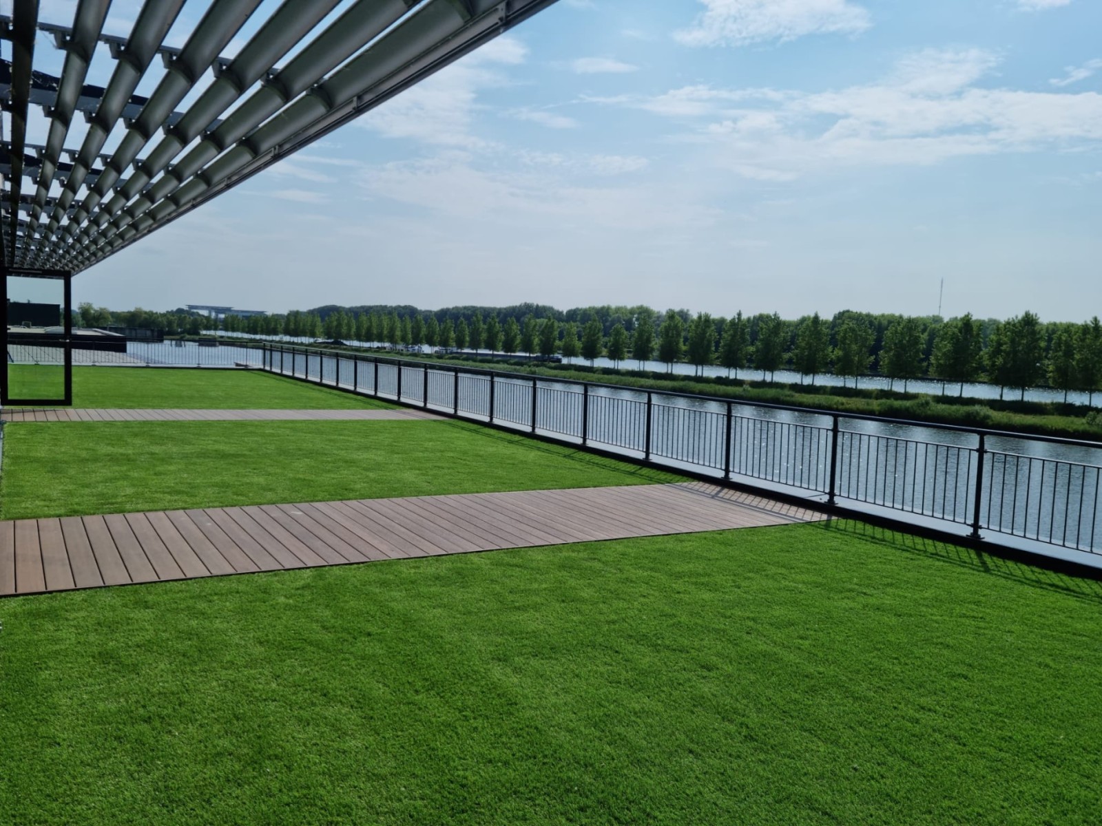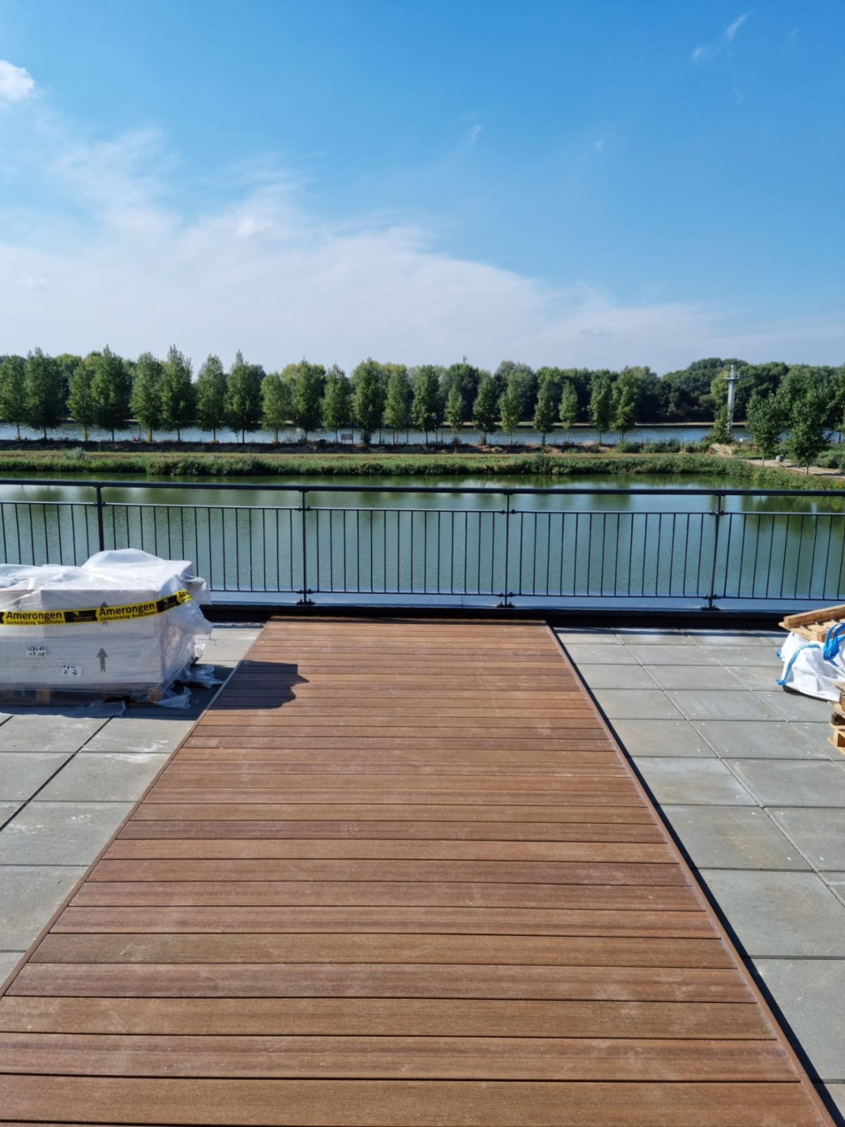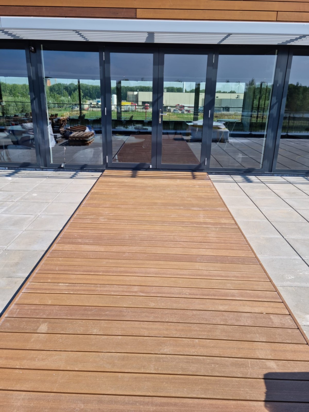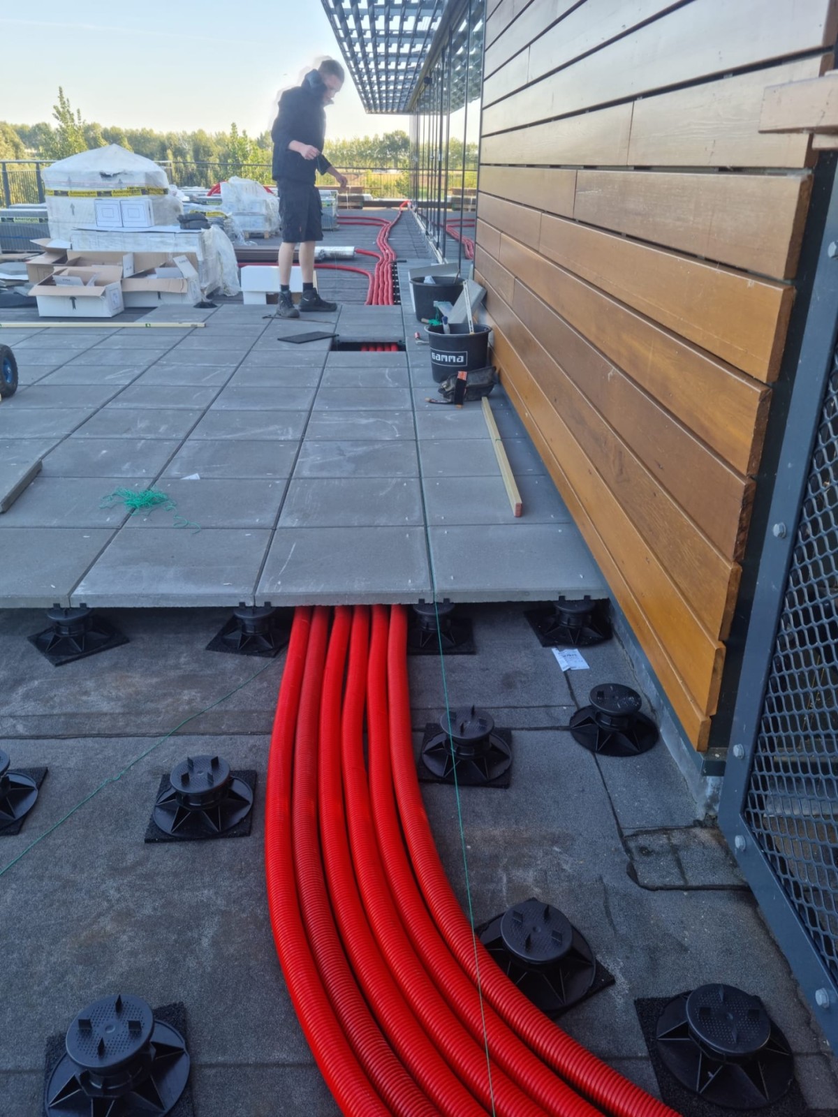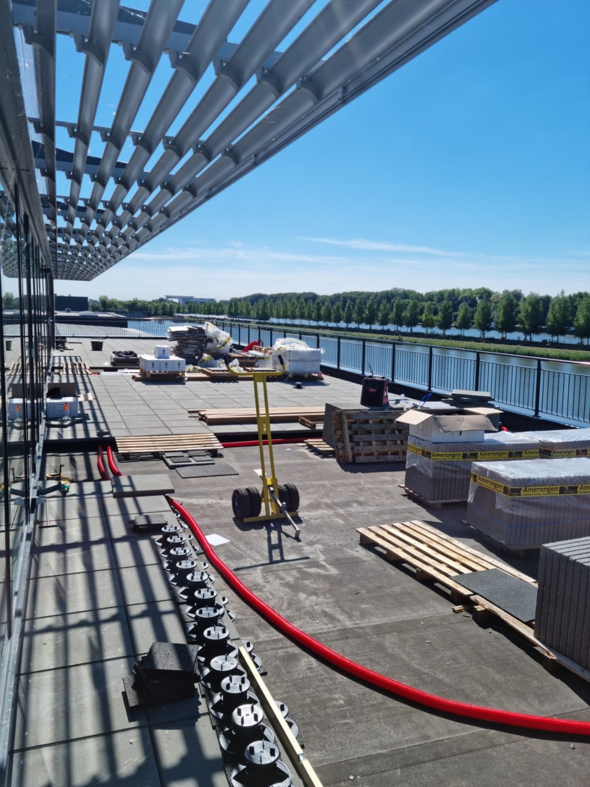 De opbouw bestaat uit verstelbare tegeldragers met betontegels die netjes aansluiten op de instap hoogte van het terras. Bij de entree's van het dakterras is gebruik gemaakt van composiet vlonders van fiberon. De planken zijn niet alleen duurzaam, maar de warme tinten sluiten aan bij de gevel uitstraling van het gebouw.