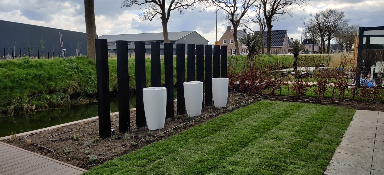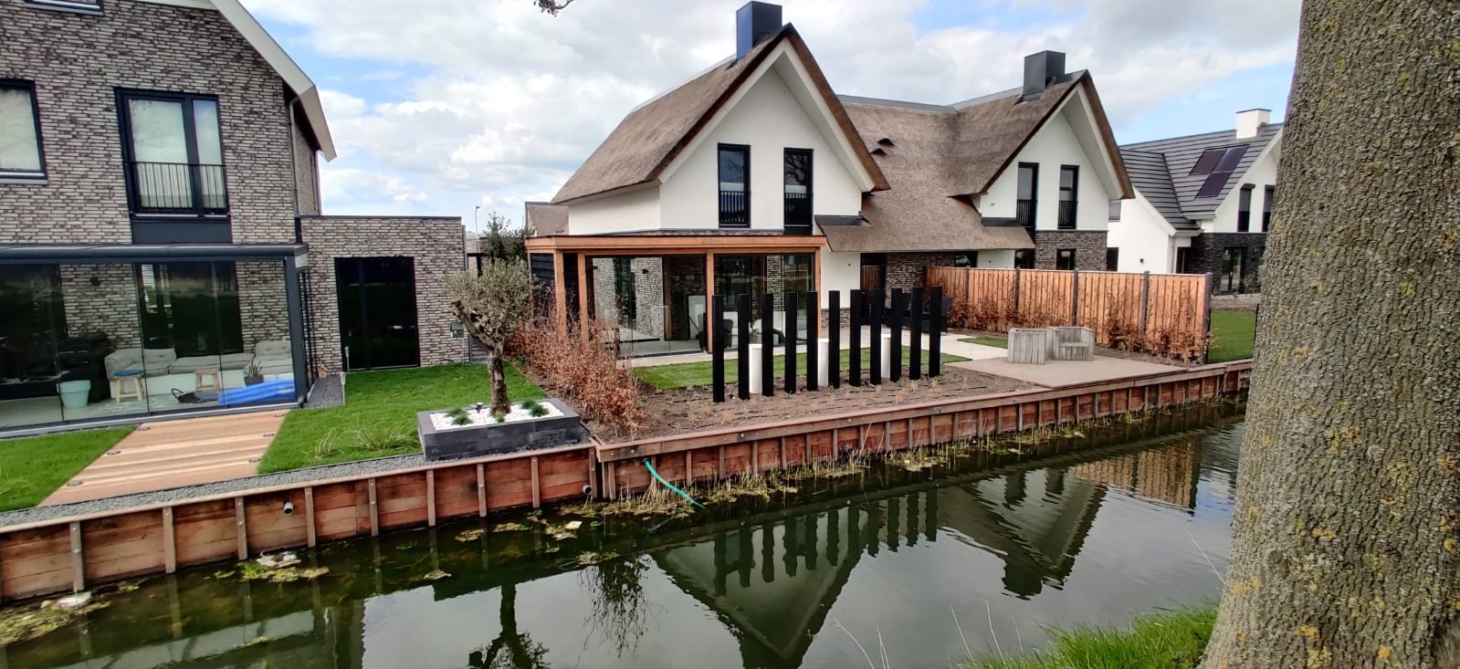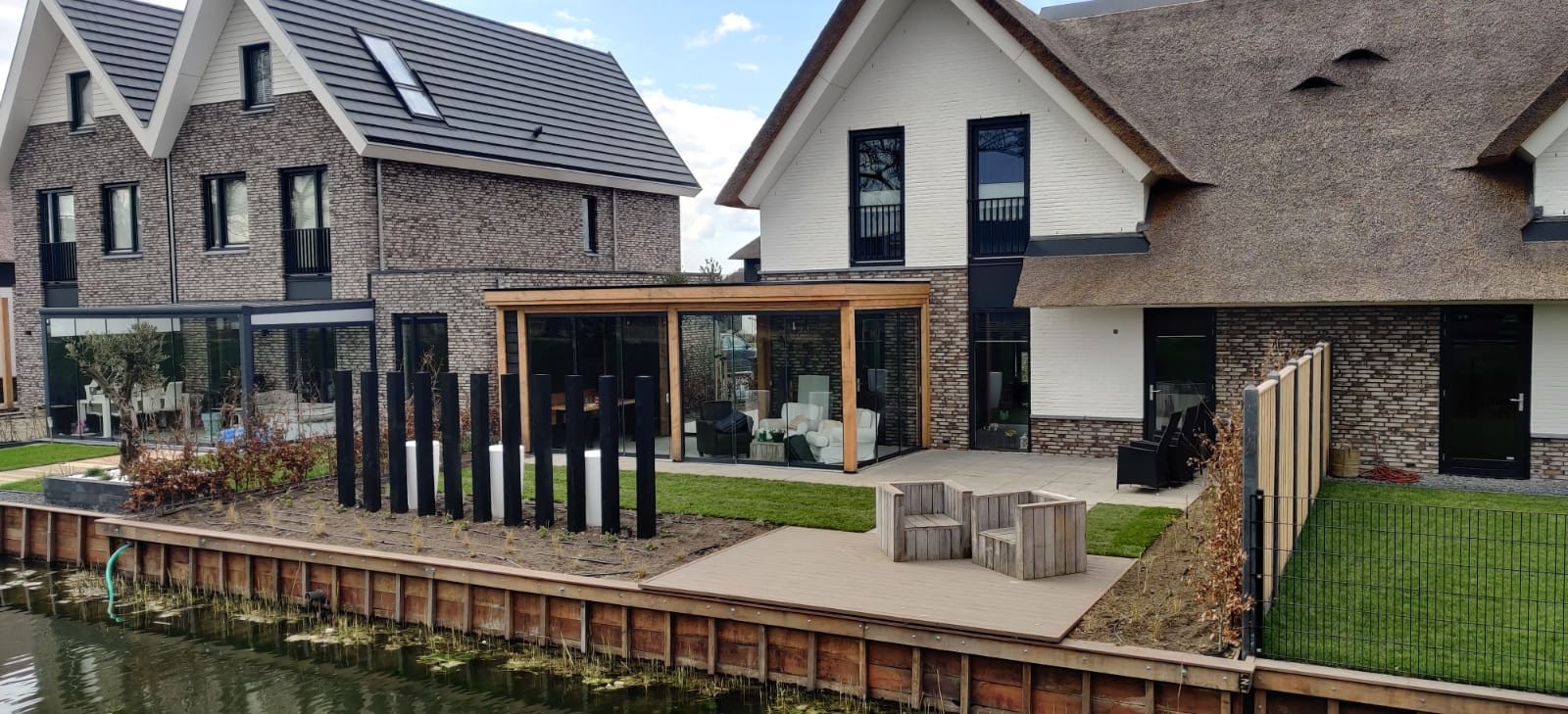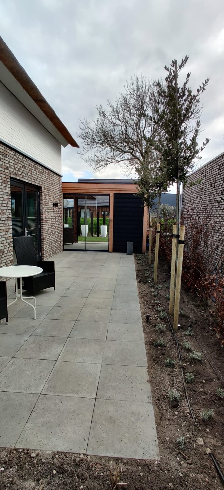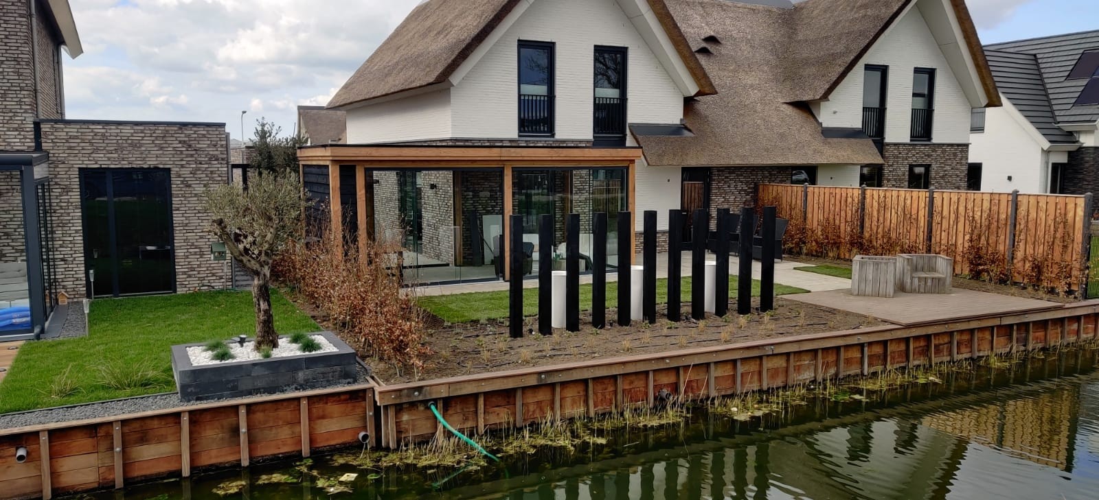 Functioneel & praktisch : De tuin heeft meerdere zitplekken rekning houdend met de zon en de gelegenheid. Zo is er een prachtige plekje aan het water gemaakt en hebben we met de gefundeerde aanbouw een prachtige ruimte gerealiseerd met veel licht en glazen schuifdeuren. In de zijtuin is ruimte gemaakt voor een groot terras die straks omarmend zal aanvoelen door de zwarte palenrij met hoge siergrassen. Het terras aan de voorzijde zal vooral dienen als schaduw plek met natuurlijke beschermen als de dakplatanen.