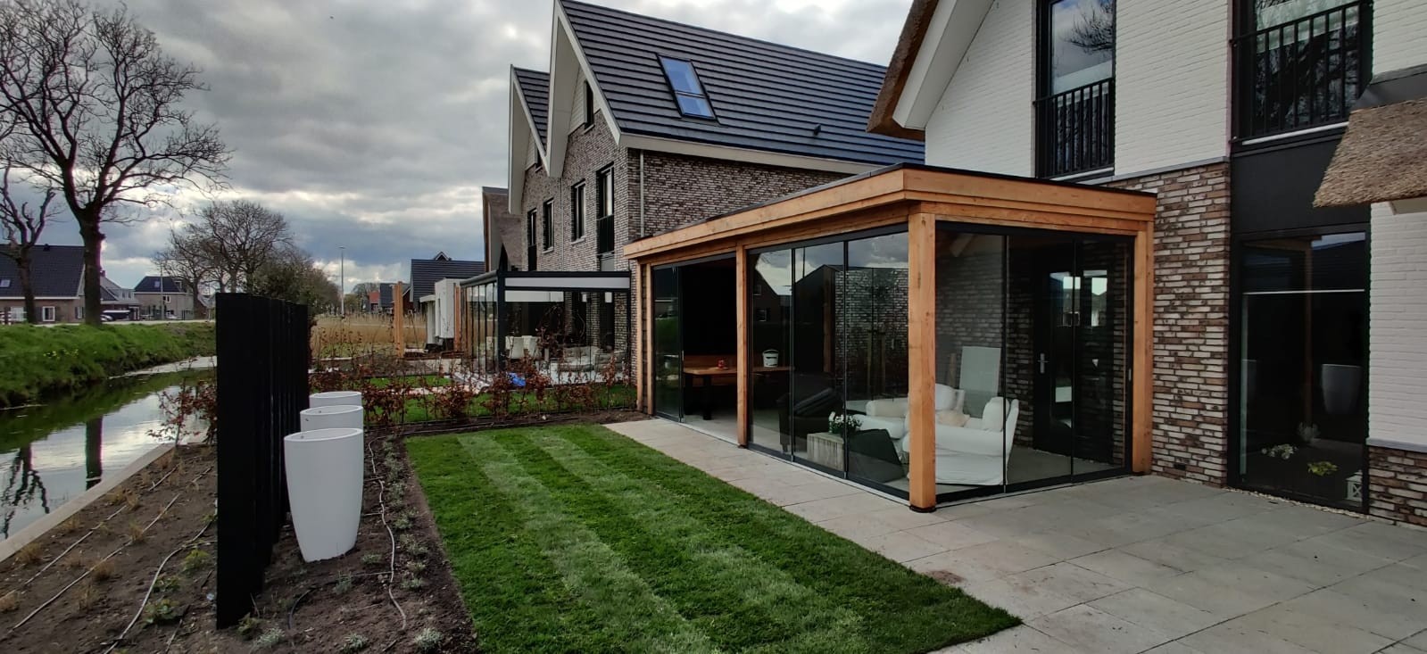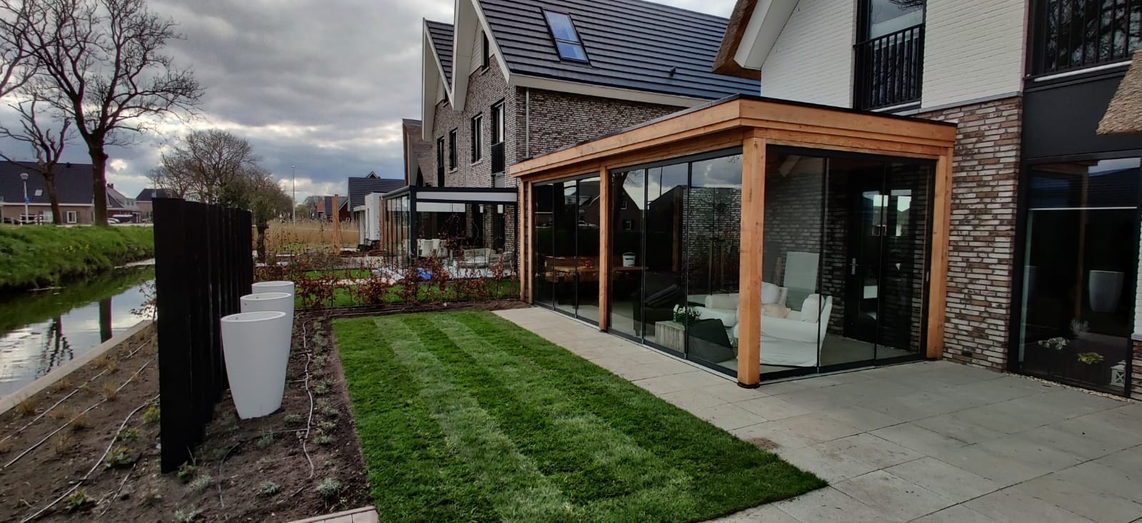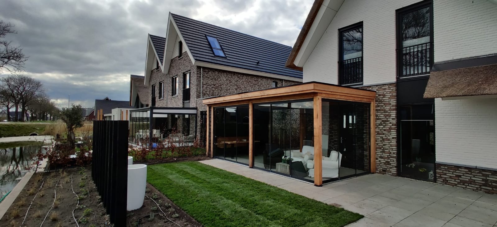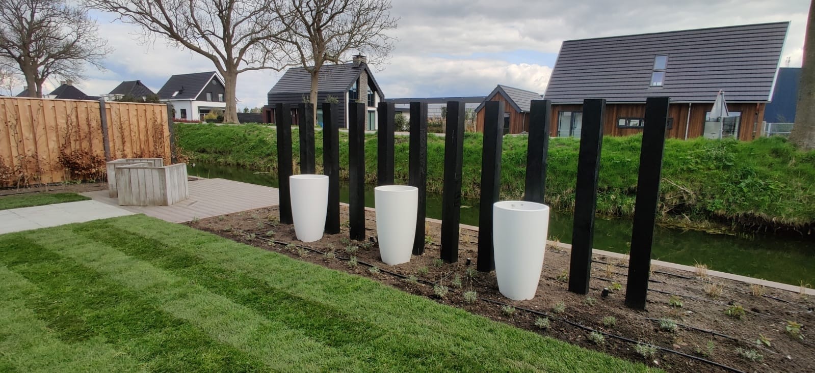 Functioneel & praktisch : De tuin heeft meerdere zitplekken rekning houdend met de zon en de gelegenheid. Zo is er een prachtige plekje aan het water gemaakt en hebben we met de gefundeerde aanbouw een prachtige ruimte gerealiseerd met veel licht en glazen schuifdeuren. In de zijtuin is ruimte gemaakt voor een groot terras die straks omarmend zal aanvoelen door de zwarte palenrij met hoge siergrassen. Het terras aan de voorzijde zal vooral dienen als schaduw plek met natuurlijke beschermen als de dakplatanen.