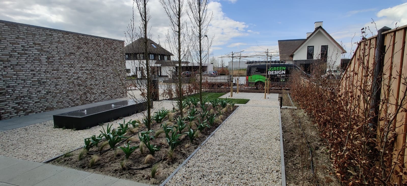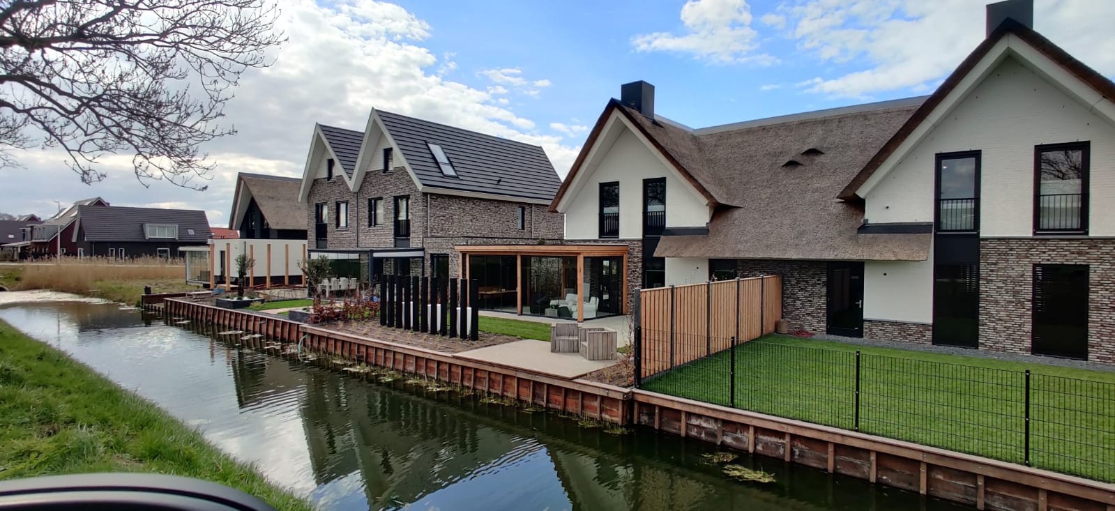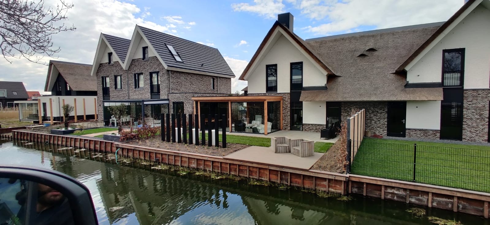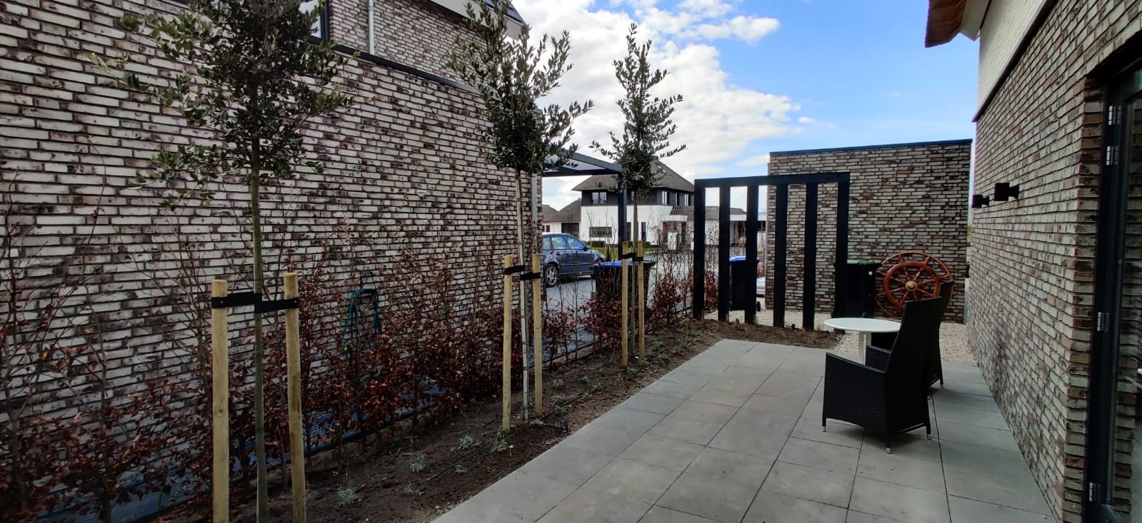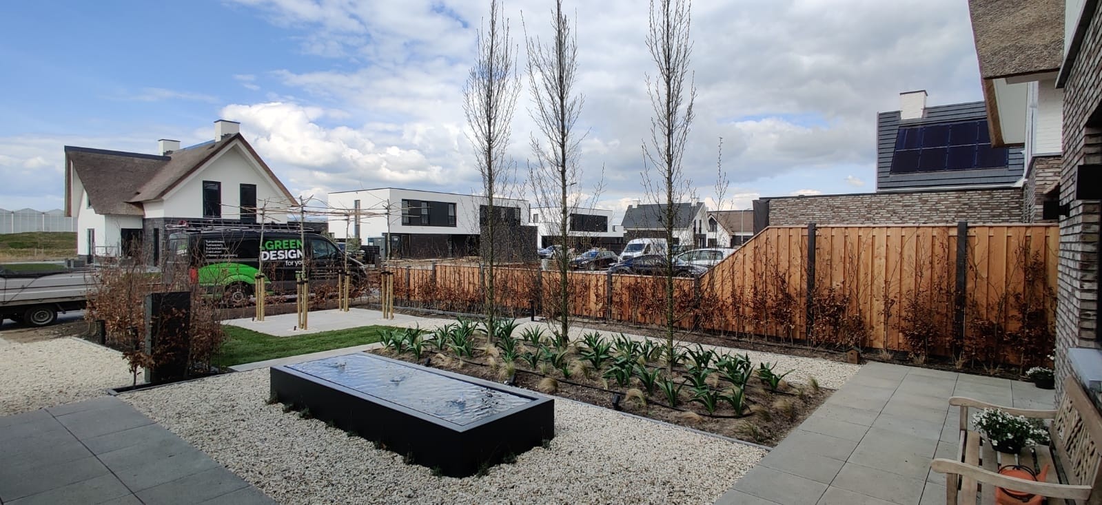 Functioneel & praktisch : De tuin heeft meerdere zitplekken rekning houdend met de zon en de gelegenheid. Zo is er een prachtige plekje aan het water gemaakt en hebben we met de gefundeerde aanbouw een prachtige ruimte gerealiseerd met veel licht en glazen schuifdeuren. In de zijtuin is ruimte gemaakt voor een groot terras die straks omarmend zal aanvoelen door de zwarte palenrij met hoge siergrassen. Het terras aan de voorzijde zal vooral dienen als schaduw plek met natuurlijke beschermen als de dakplatanen.