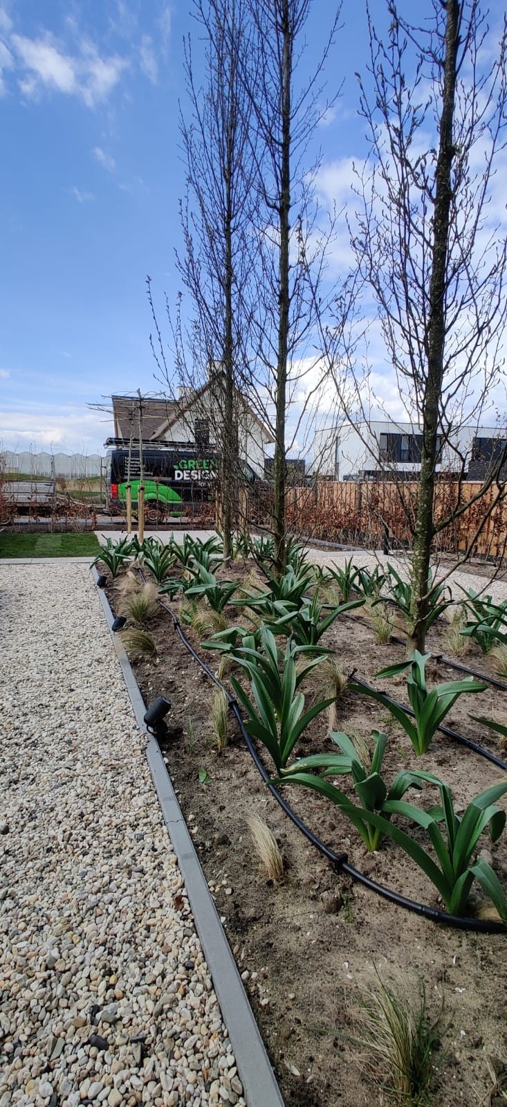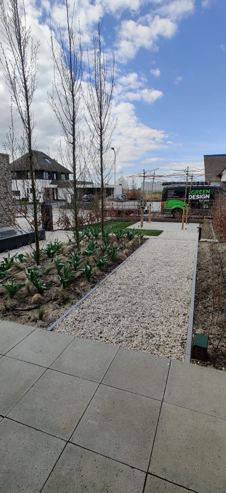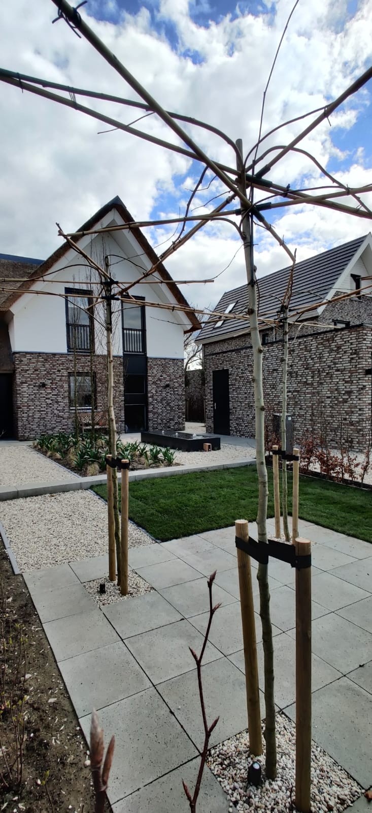 Landelijk en Robuust : Bij het bedenken en realiseren van deze landelijke tuin, zijn robuuste en materialen met karakter gebruikt die het aanzicht op de woning zullen versterken. Zo hebben we schellevis tegels toegepast die zeer goed matchen bij het karakter van de woning. De robuuste palen hebben we een zwarte kleur gegeven, die knipogen bij de wwatertafel, glazenschuifwanden, armaturen van de verlichting en kozijnen van de woning. Bij de combinatie tussen zwart, wit en grijs zal de fris groene beplanting eruit springen en zorgen voor een zorgvuldig contrast.