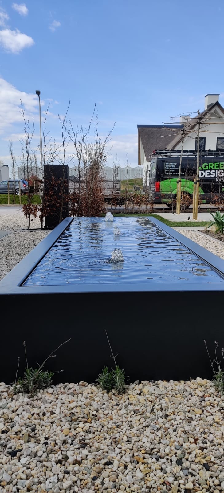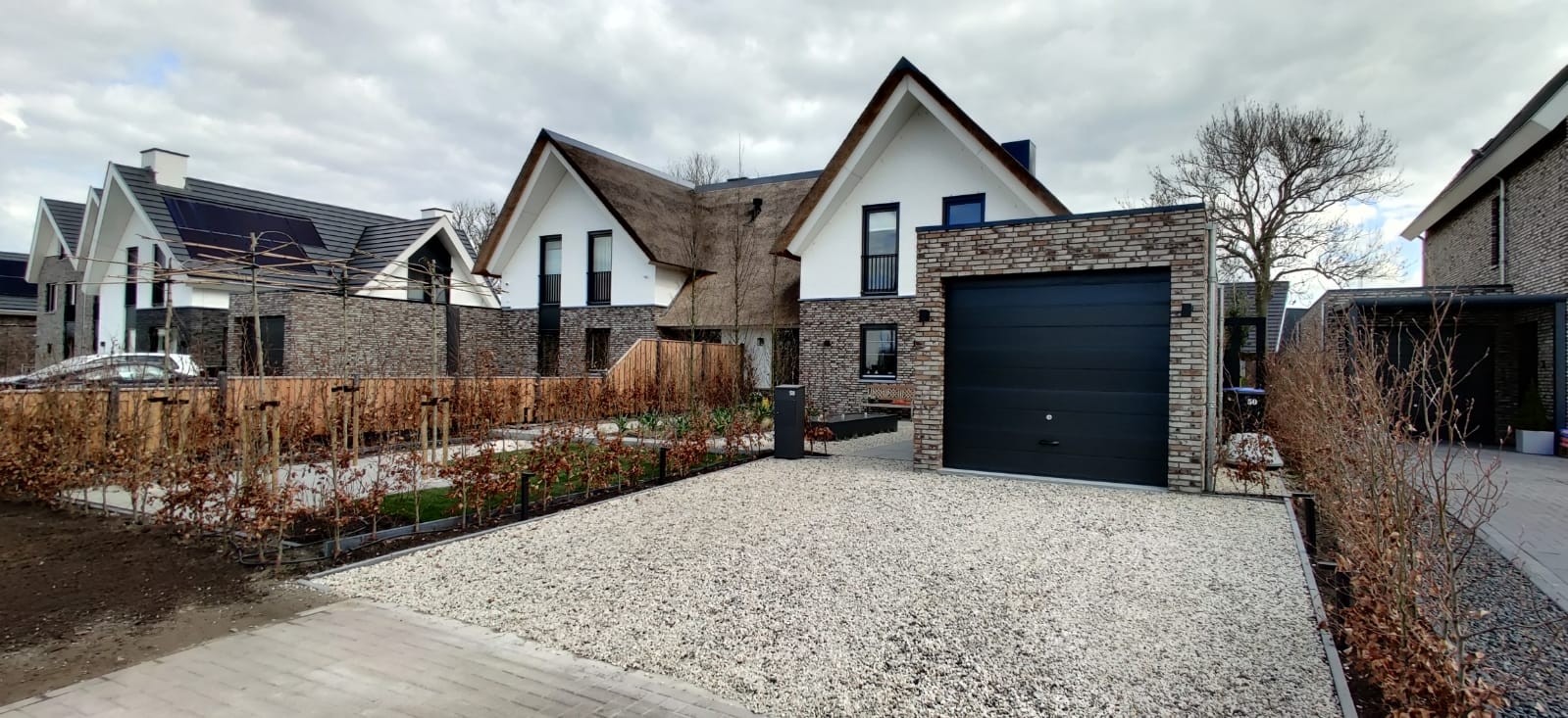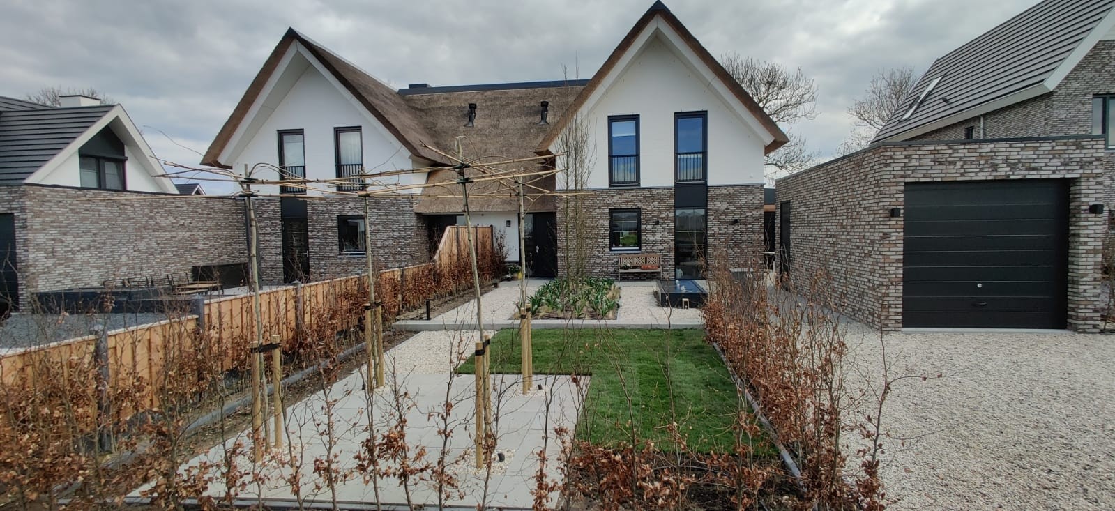 Landelijk en Robuust : Bij het bedenken en realiseren van deze landelijke tuin, zijn robuuste en materialen met karakter gebruikt die het aanzicht op de woning zullen versterken. Zo hebben we schellevis tegels toegepast die zeer goed matchen bij het karakter van de woning. De robuuste palen hebben we een zwarte kleur gegeven, die knipogen bij de wwatertafel, glazenschuifwanden, armaturen van de verlichting en kozijnen van de woning. Bij de combinatie tussen zwart, wit en grijs zal de fris groene beplanting eruit springen en zorgen voor een zorgvuldig contrast.