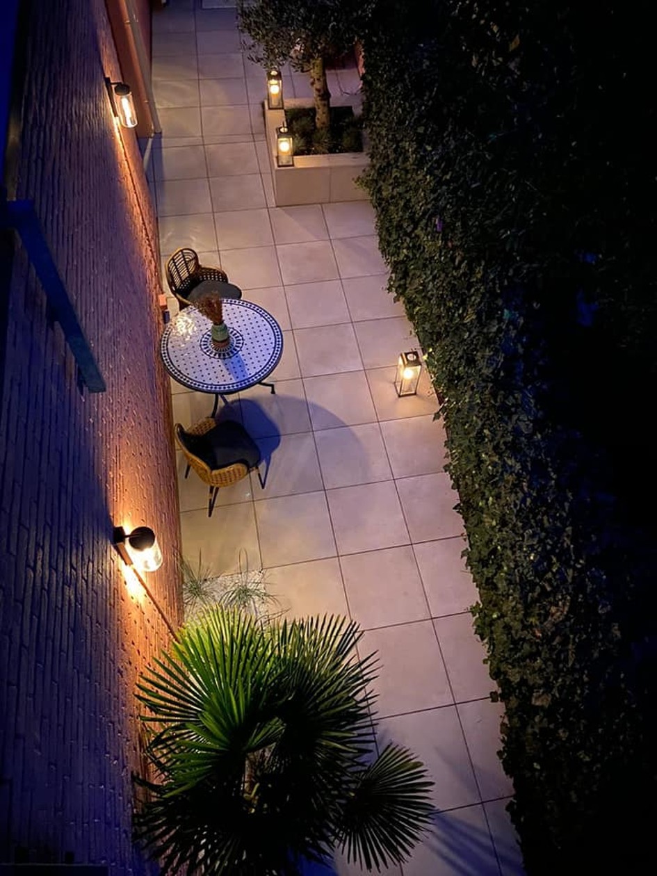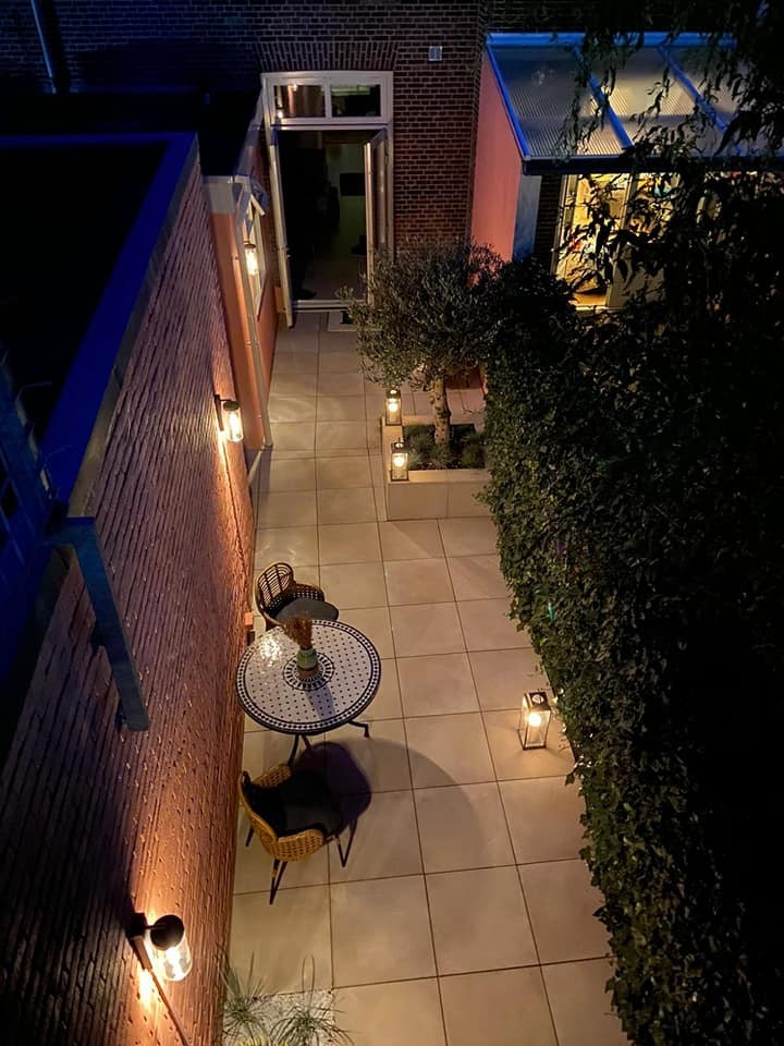 De tuinverlichting zorgt voor een warme en romantische setting. 's Avonds dineren in deze tuin voelt dan ook echt als vakantie, maar ook het kijken ernaar deed deze mensen al stralen. Daarbij is onze missie dan ook meer dan geslaagd.