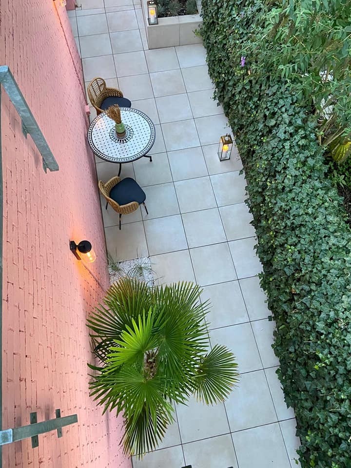 De wens voor een Marokkaanse tuin is in vervulling gaan. De kwalitatieve, zandkleurige keramische tegels zorgen voor een egale, maar toch het juiste gevoel in de beleving van Marokko. Daarnaast zijn de muren van terracotta doorslaggevend. Zonder deze kleurensamenstelling valt de beleving moeilijk waar te maken.