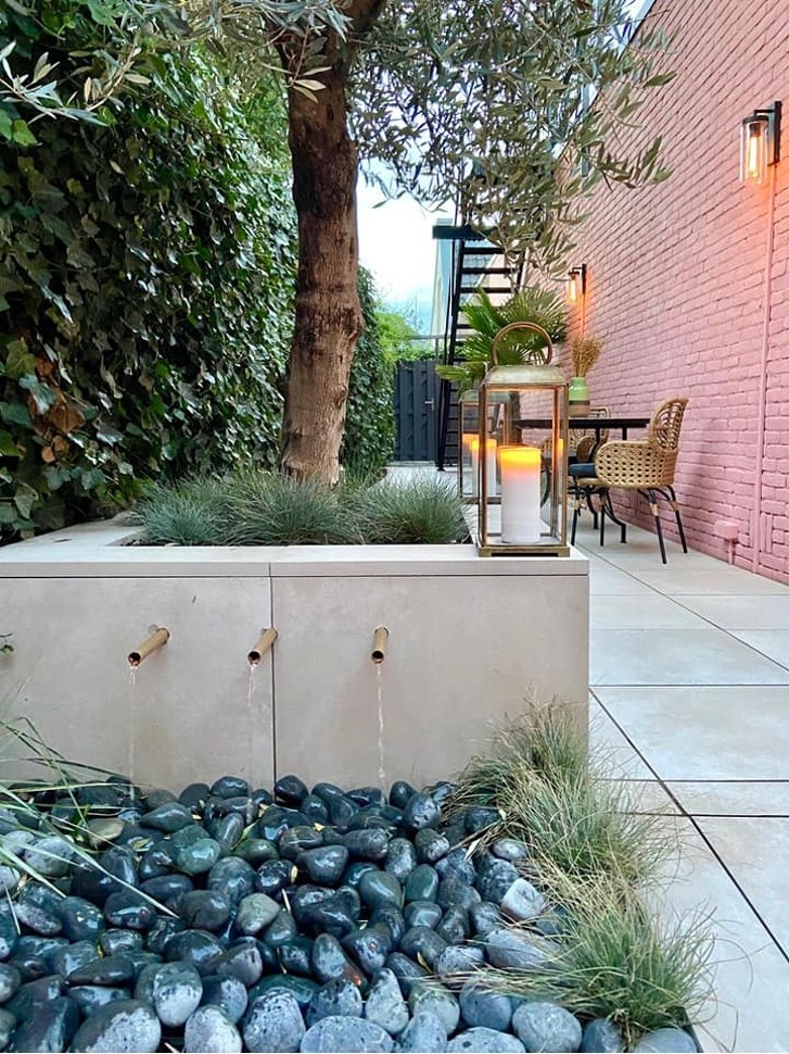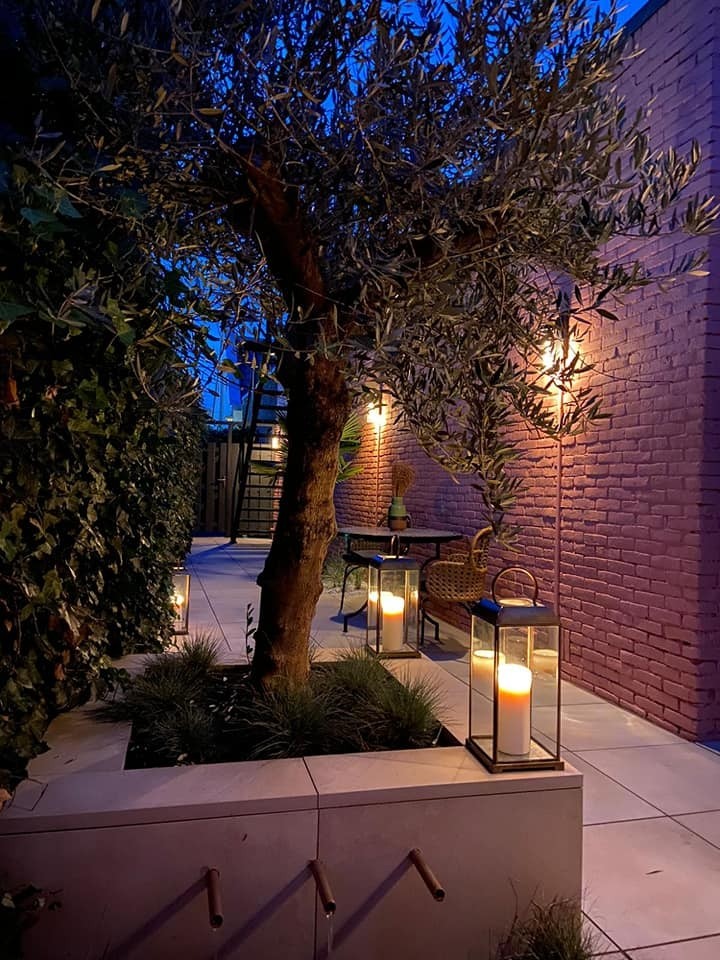 Creatief omgaan met de ruimte was een must door de lange smalle tuin. De olijf boom is daarom verhoogd geplaatst in de vorm van een plantenbak van dezelfde tegels als de bestrating. Door creatief te zijn is het water ornament in deze plantenbak een ware eye catcher geworden met de gouden uitlopen.