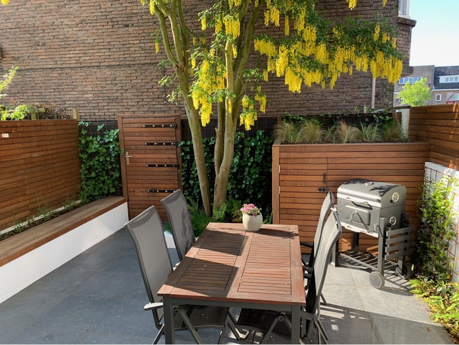 Een kleine tuin. Een moderne tuin. Met deze stadstuin gaat de wens van warmte, groen en functioneel zeker in vervulling!