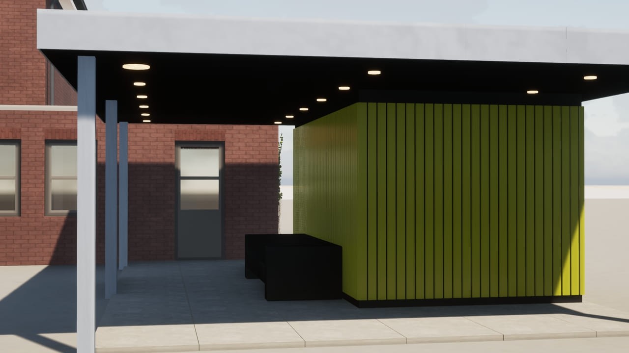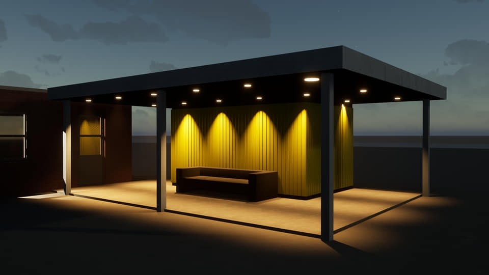 Constructie : De overkapping heeft een framewerk van verzinkt staal. Het frame moest duurzaam en voor lange termijn meekunnen met oog op een mantelzorgwoning. Daarbuiten kwam het verzinkte staal meerdere malen terug in de huidige woning. Dit versterkt het esthetische aanzicht van de overkapping.