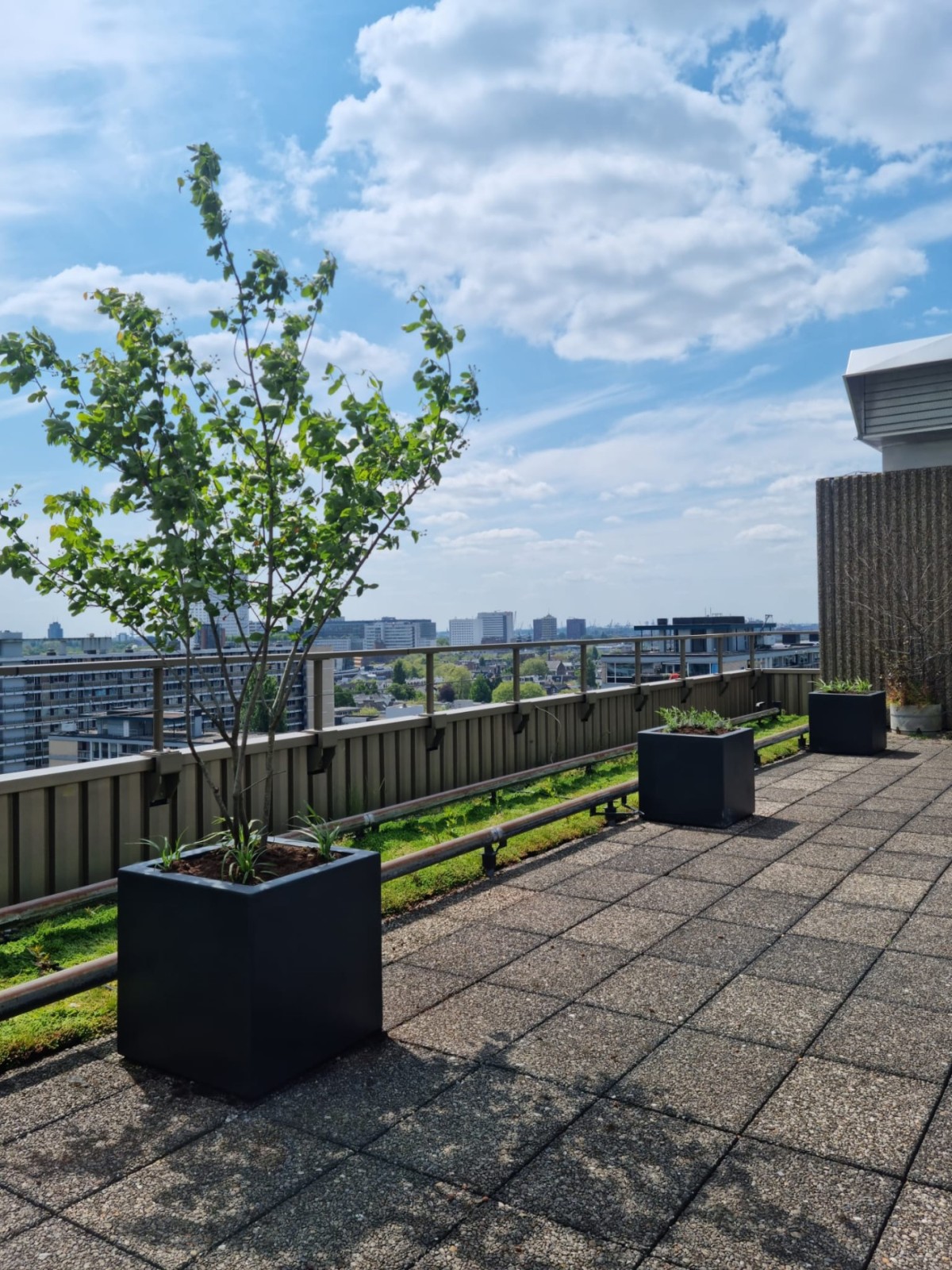 Om het dakterras te vullen hebben we hufterproof bakken gekozen. Antraciet en gemaakt van polyester maakt ze licht van gewicht en hufterproof. De krentenbomen geven de ruimte vulling en bloeien prachtig in het voorjaar. De lavendel en lirope zorgen voor altijd groene en kleurrijke bakken!
