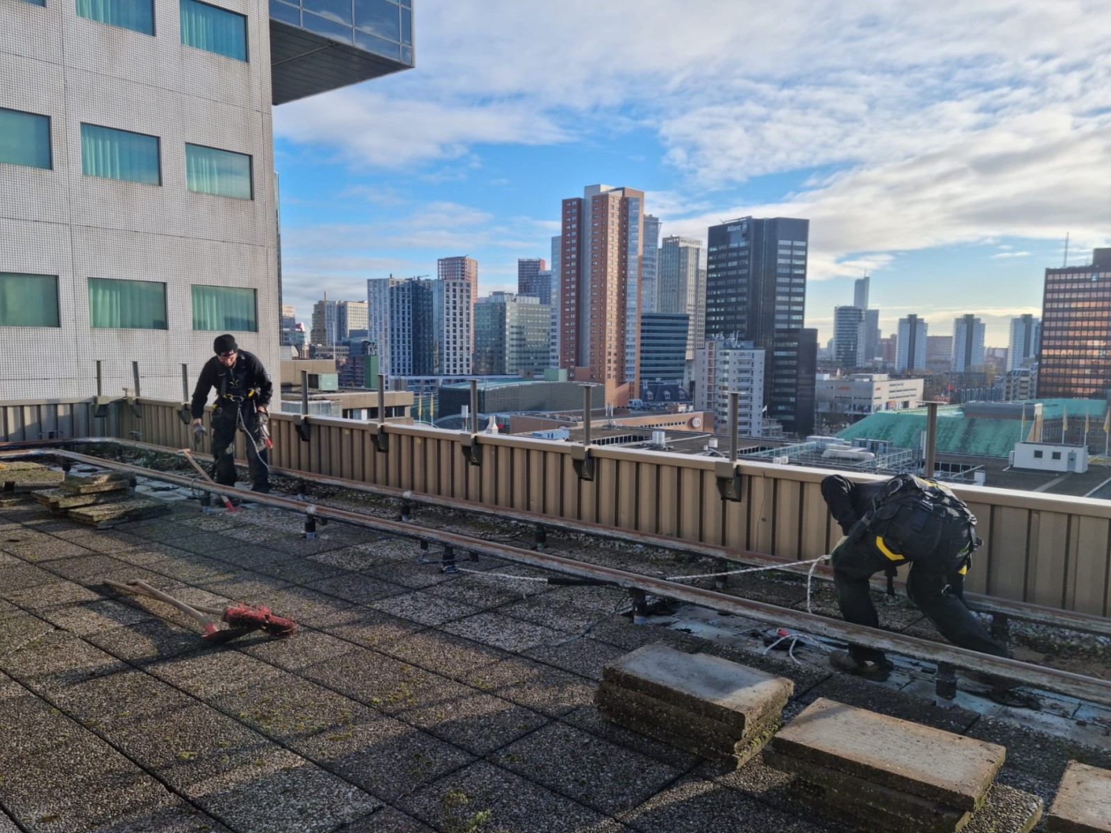 Microlab koos voor een groen dakterras in hartje rotterdam. De rails voor de glazenwassersbak diende als de perfecte plek zonder ruimte in te leveren. Zo hebben we bijna 120m2 sedumcassetes kunnen verwerken onder de rails. Zelfs op 11 hoog hebben we bijen weten te lokken!