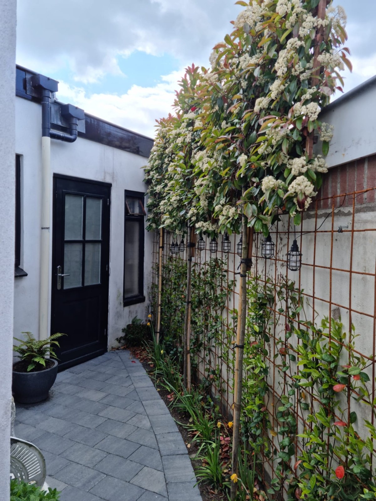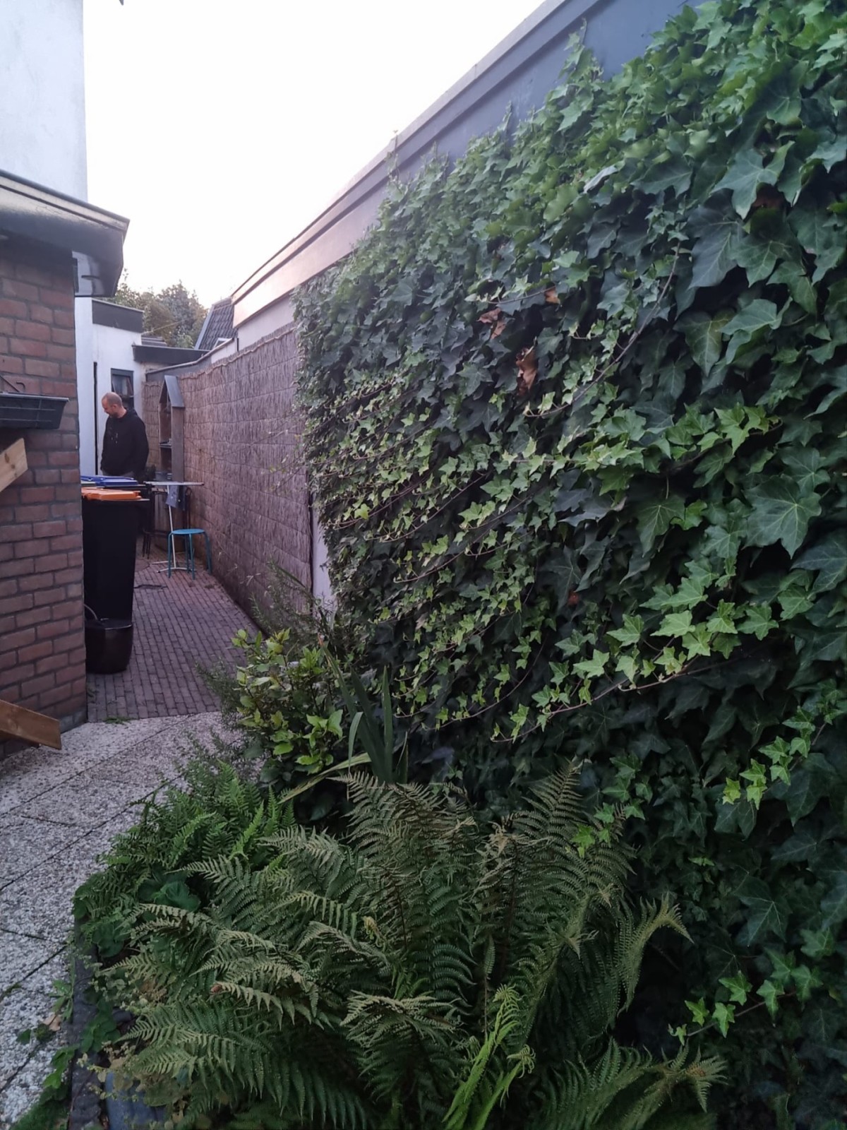 De lange muur is in zijn geheel bedekt met toscaanse jasmijn. Groenblijvend, prachtige rijke bloei, trekt onwijs veel bijen aan en geurt ook nog eens lekker!