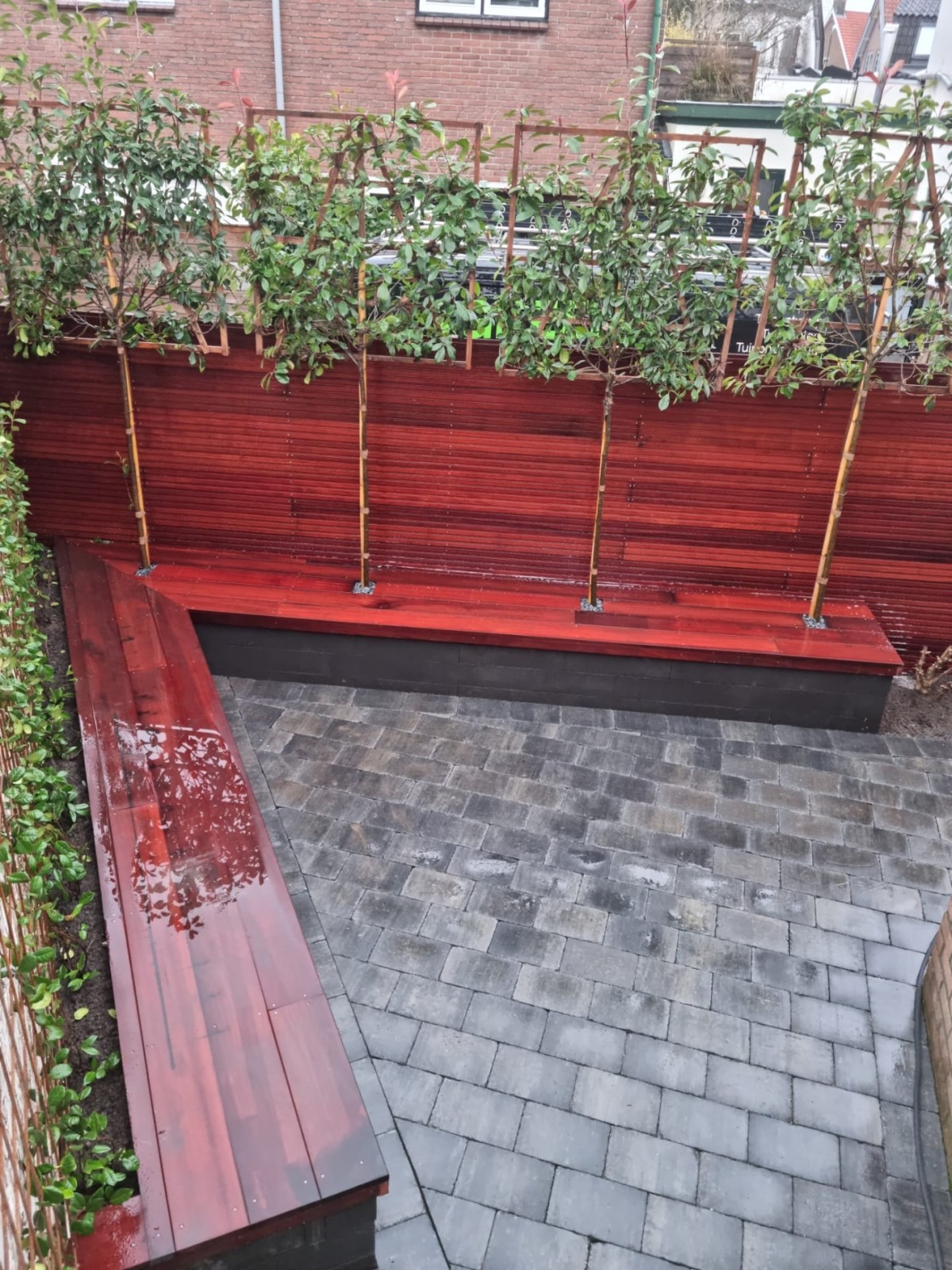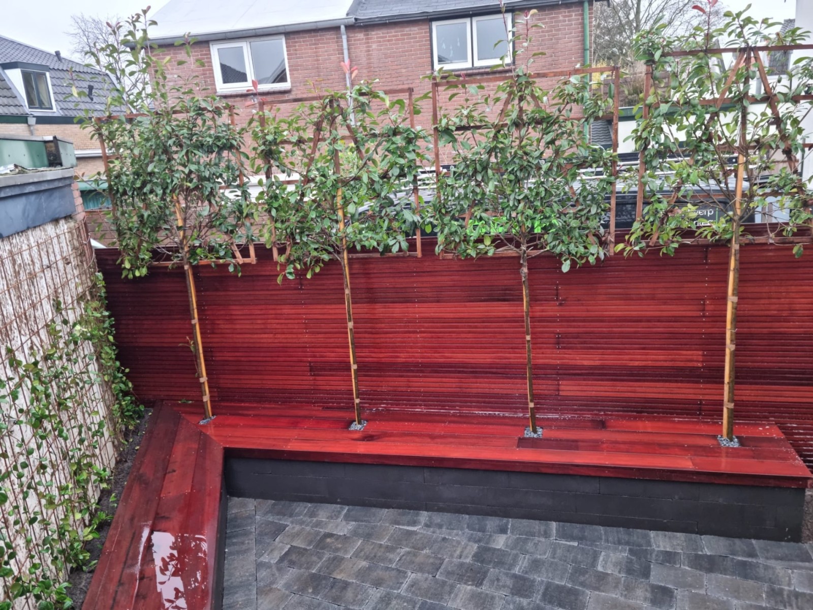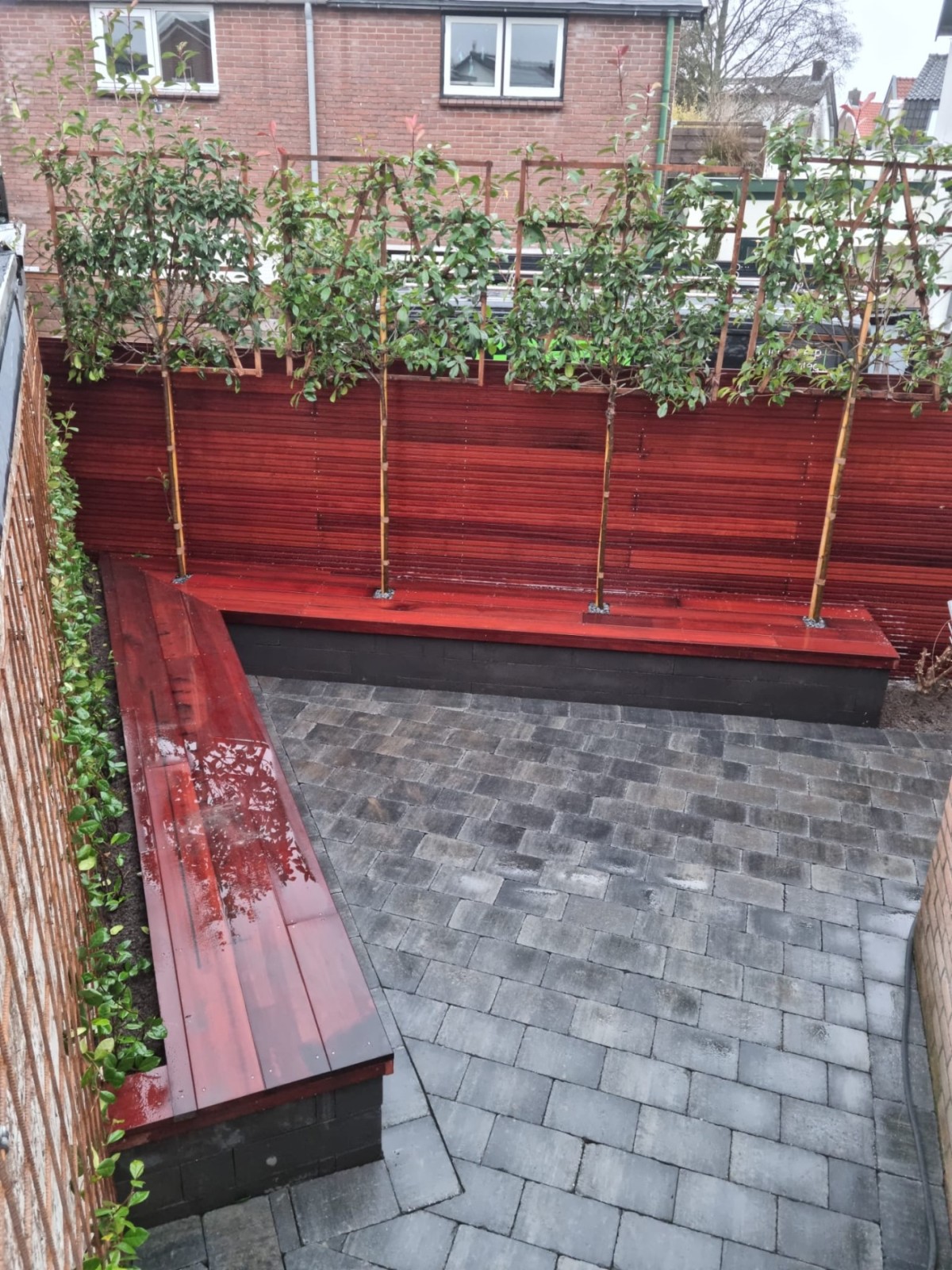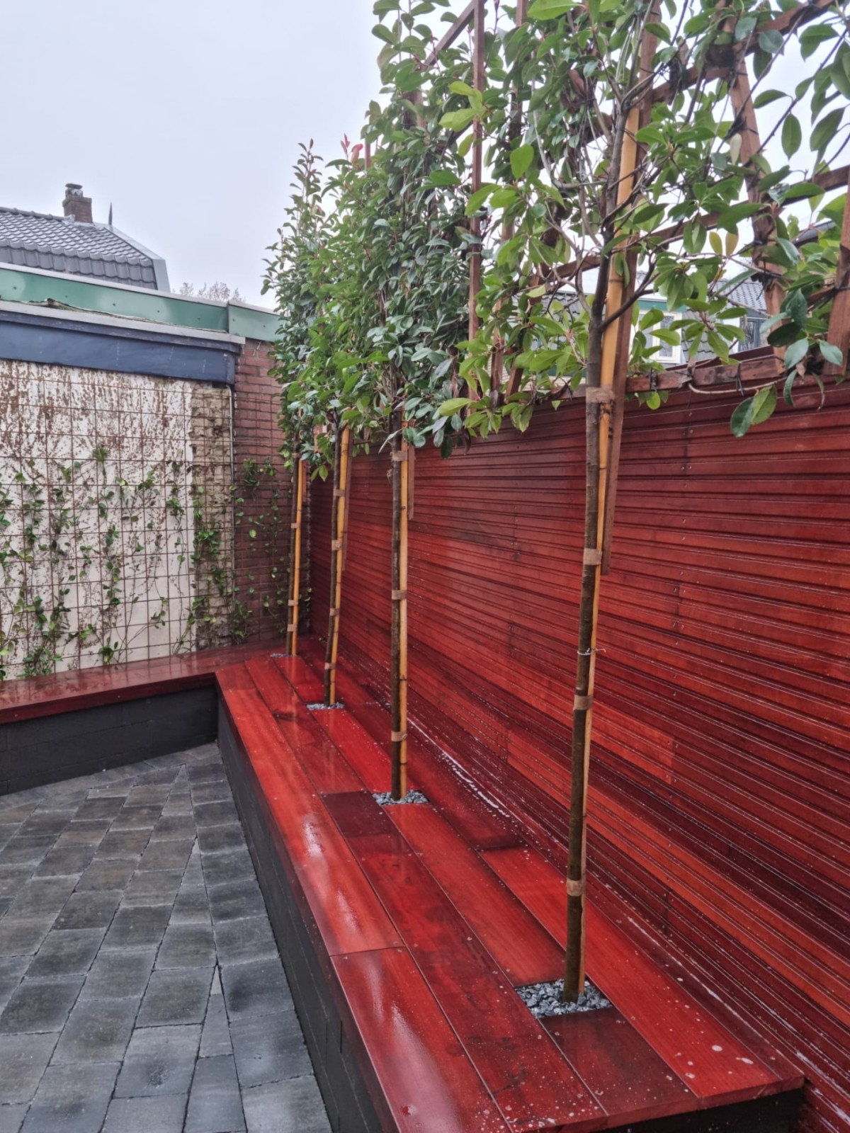 Wij hebben in het ontwerp daarop het volgende toegepast. De privacy hebben we gemaakt door grote groenblijvende leibomen te plaatsen, die in het voorjaar prachtig in de bloei staan. We hebben de erfafscheiding gemaakt van hardhouten rhombus planken en horizontaal gedekt om de ruimte optisch groot te houden.