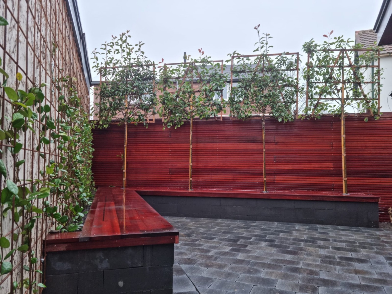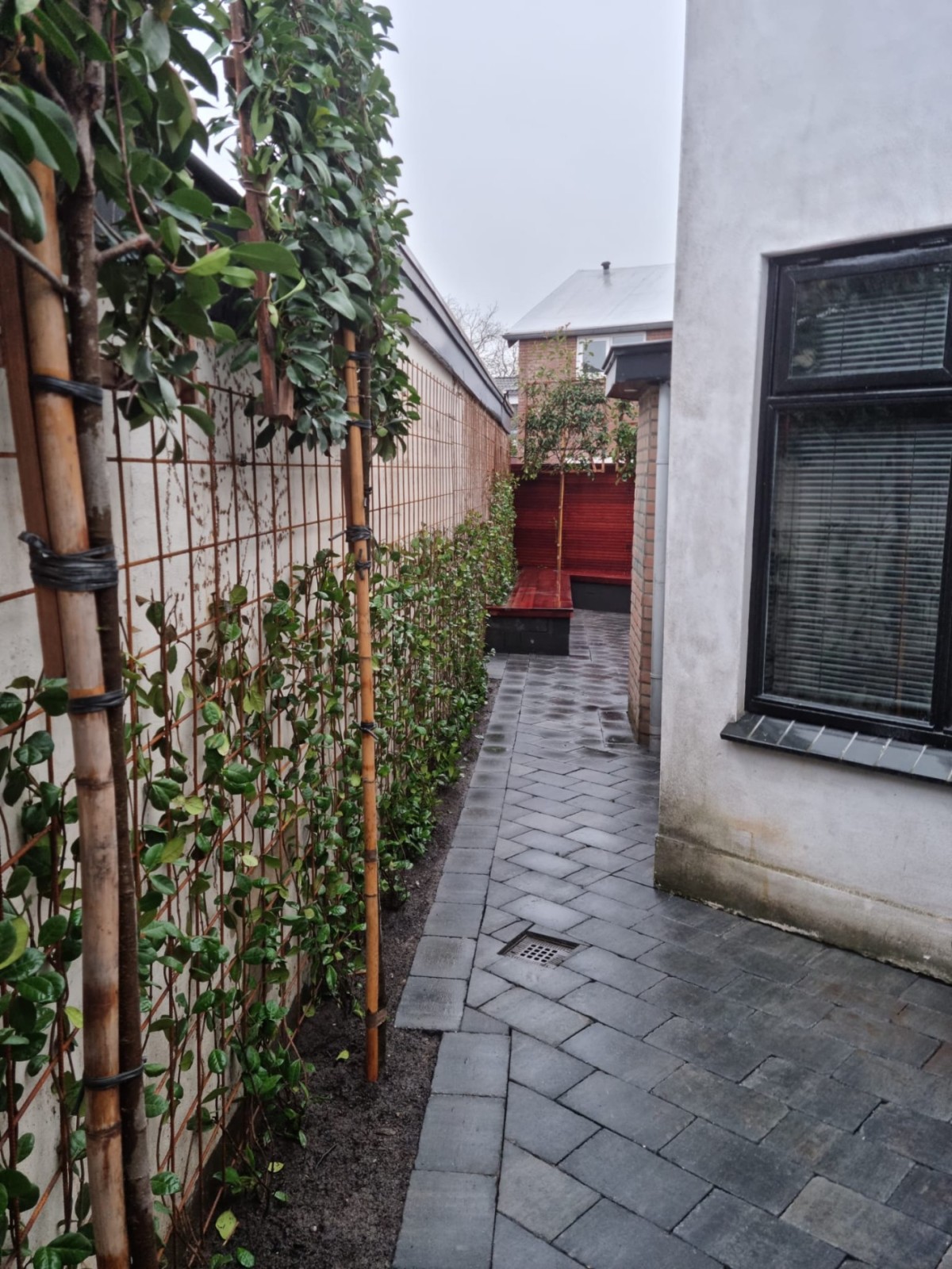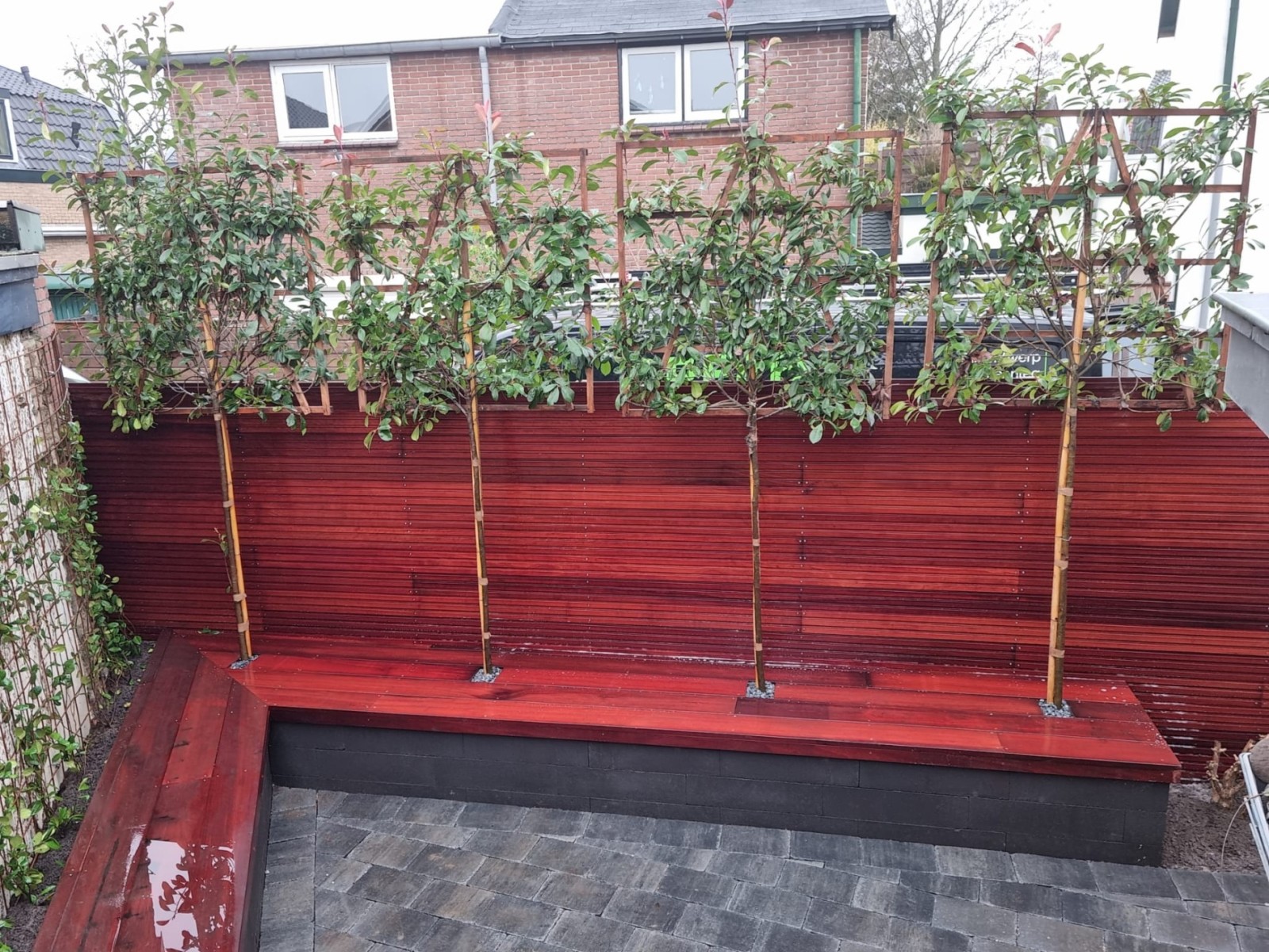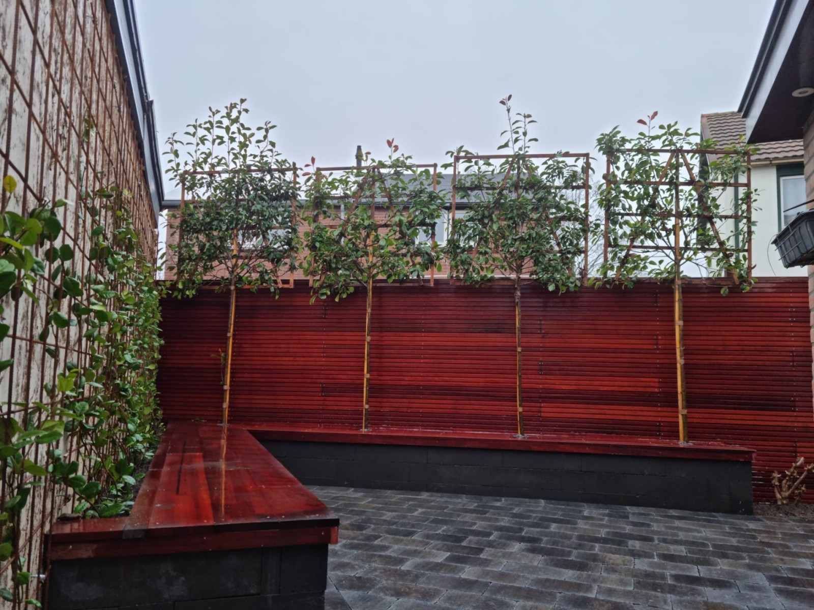 Wij hebben in het ontwerp daarop het volgende toegepast. De privacy hebben we gemaakt door grote groenblijvende leibomen te plaatsen, die in het voorjaar prachtig in de bloei staan. We hebben de erfafscheiding gemaakt van hardhouten rhombus planken en horizontaal gedekt om de ruimte optisch groot te houden.