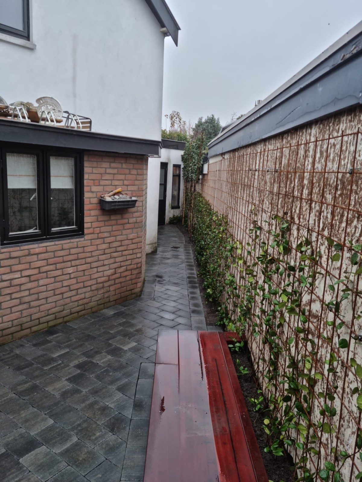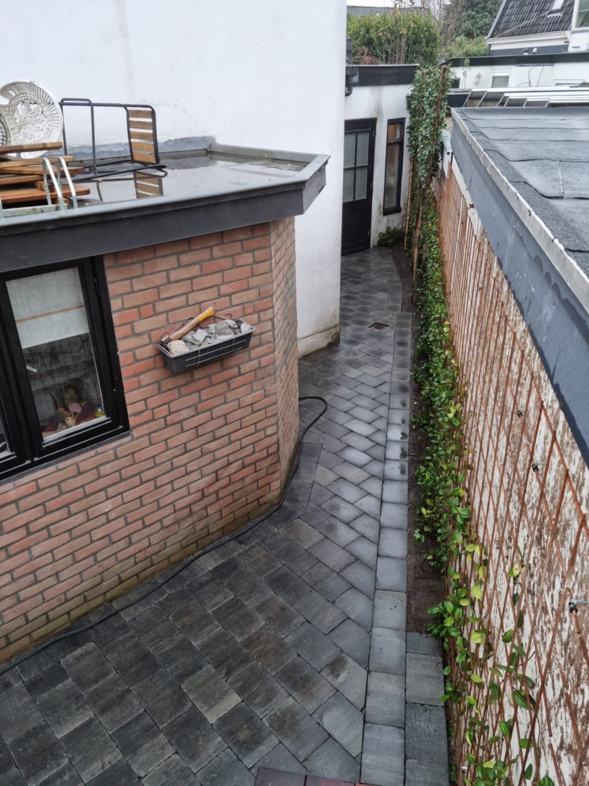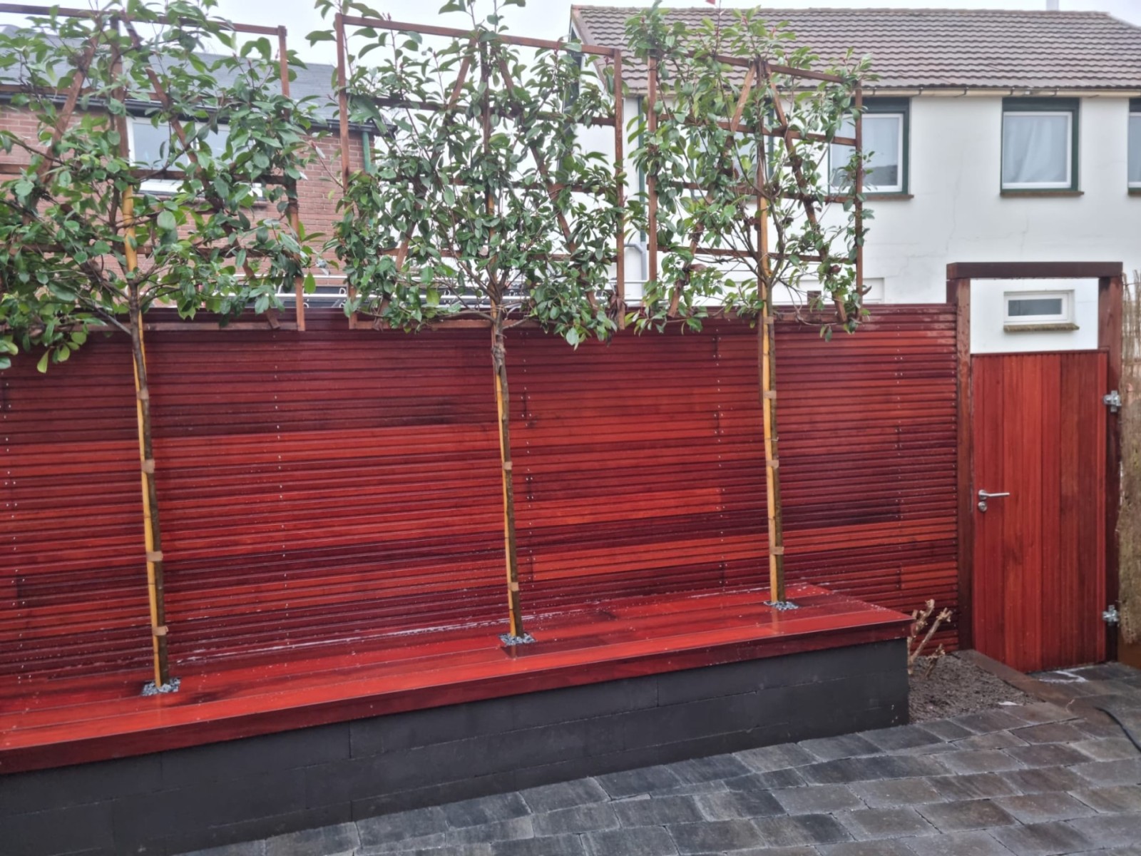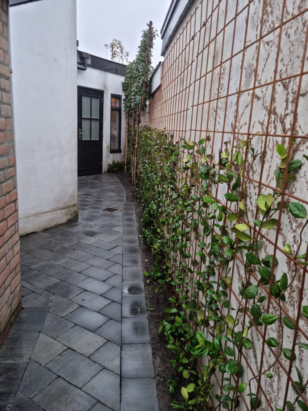 Wij hebben in het ontwerp daarop het volgende toegepast. De privacy hebben we gemaakt door grote groenblijvende leibomen te plaatsen, die in het voorjaar prachtig in de bloei staan. We hebben de erfafscheiding gemaakt van hardhouten rhombus planken en horizontaal gedekt om de ruimte optisch groot te houden.