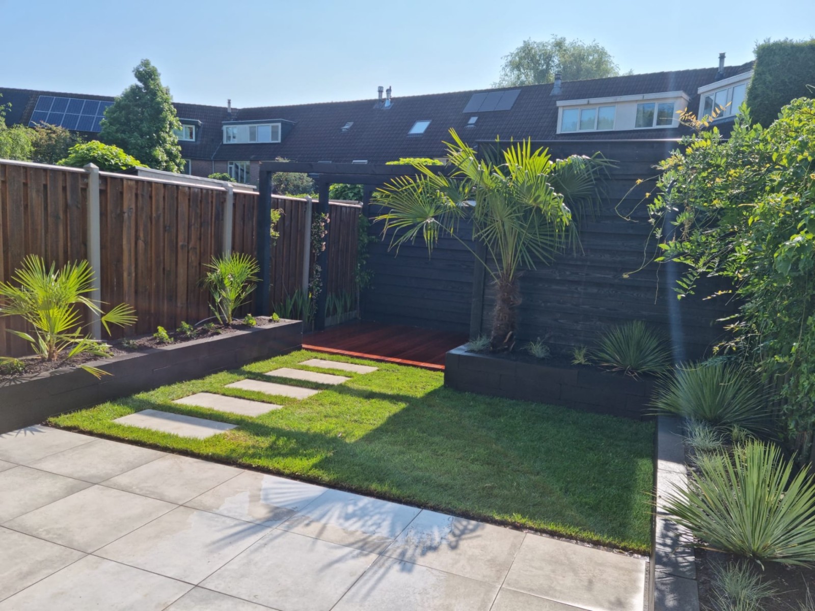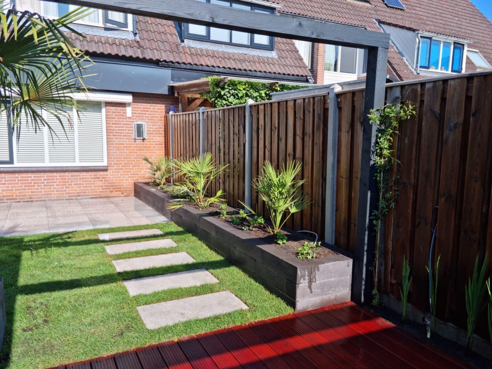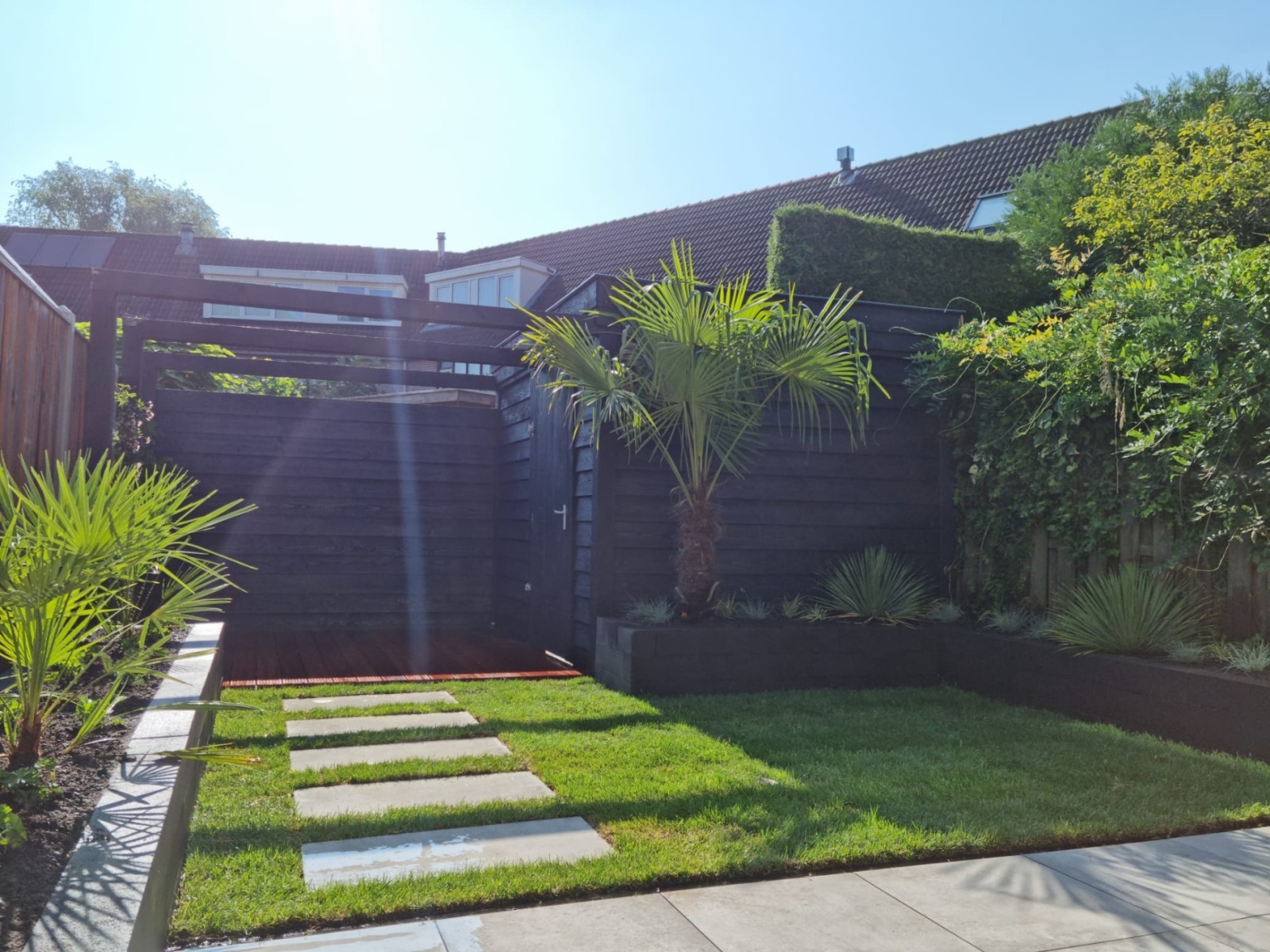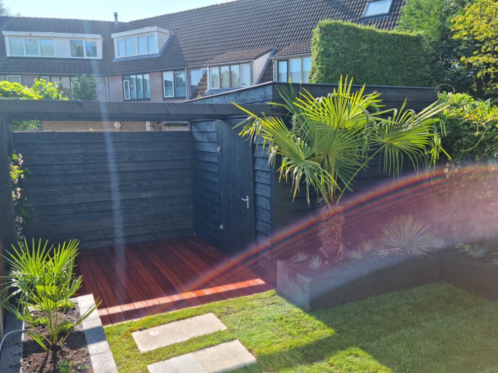 We hebben een douglasberging in ral kleur gespoten geplaats. Aan deze berging hebben we een pergola ook in de zelfde kleuren gemaakt, waardoor het ophangen van een schommel of hangmat mogelijk was. We hebben gezorgd voor afwisseling in materialen, zoals klinkers, keramische tegels, stapstenen van keramiek en hardhouten vlonders. Hierdoor blijft de tuin speels en afwisselend.
