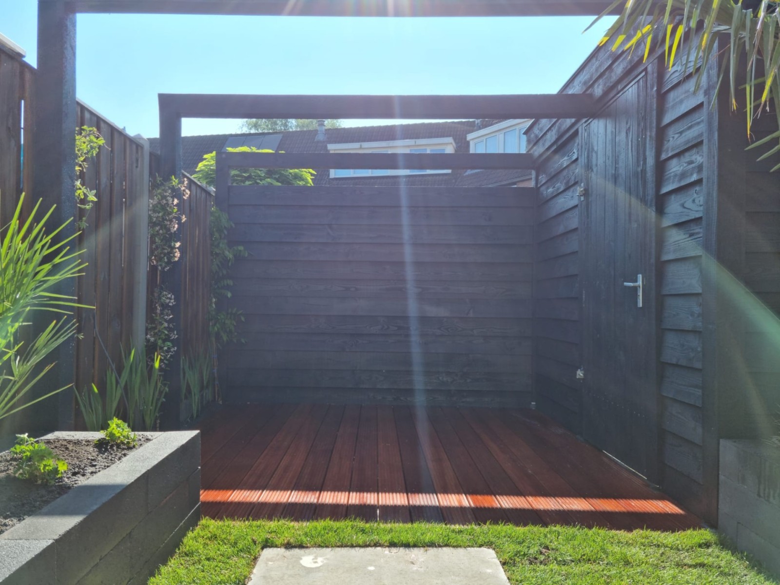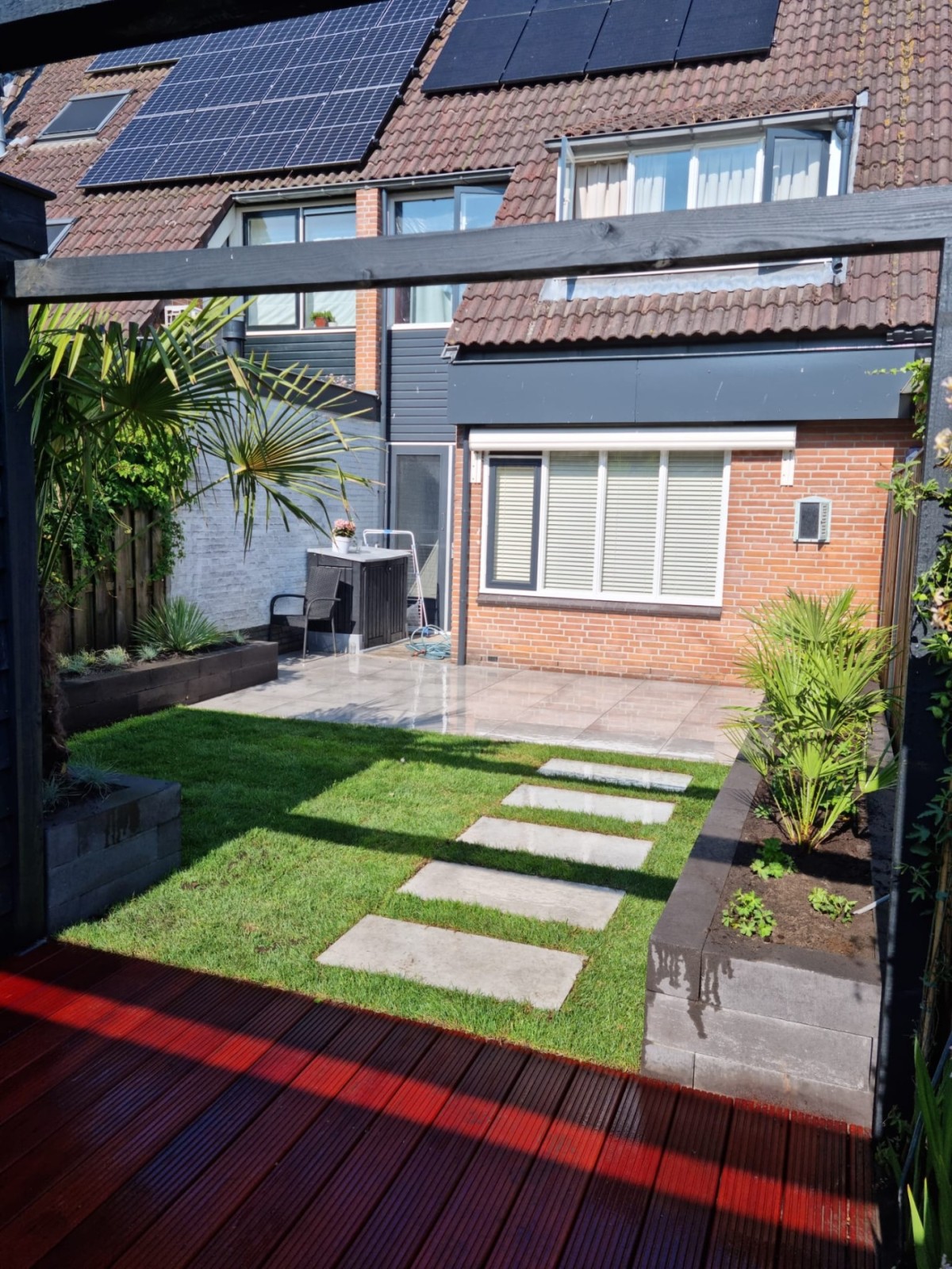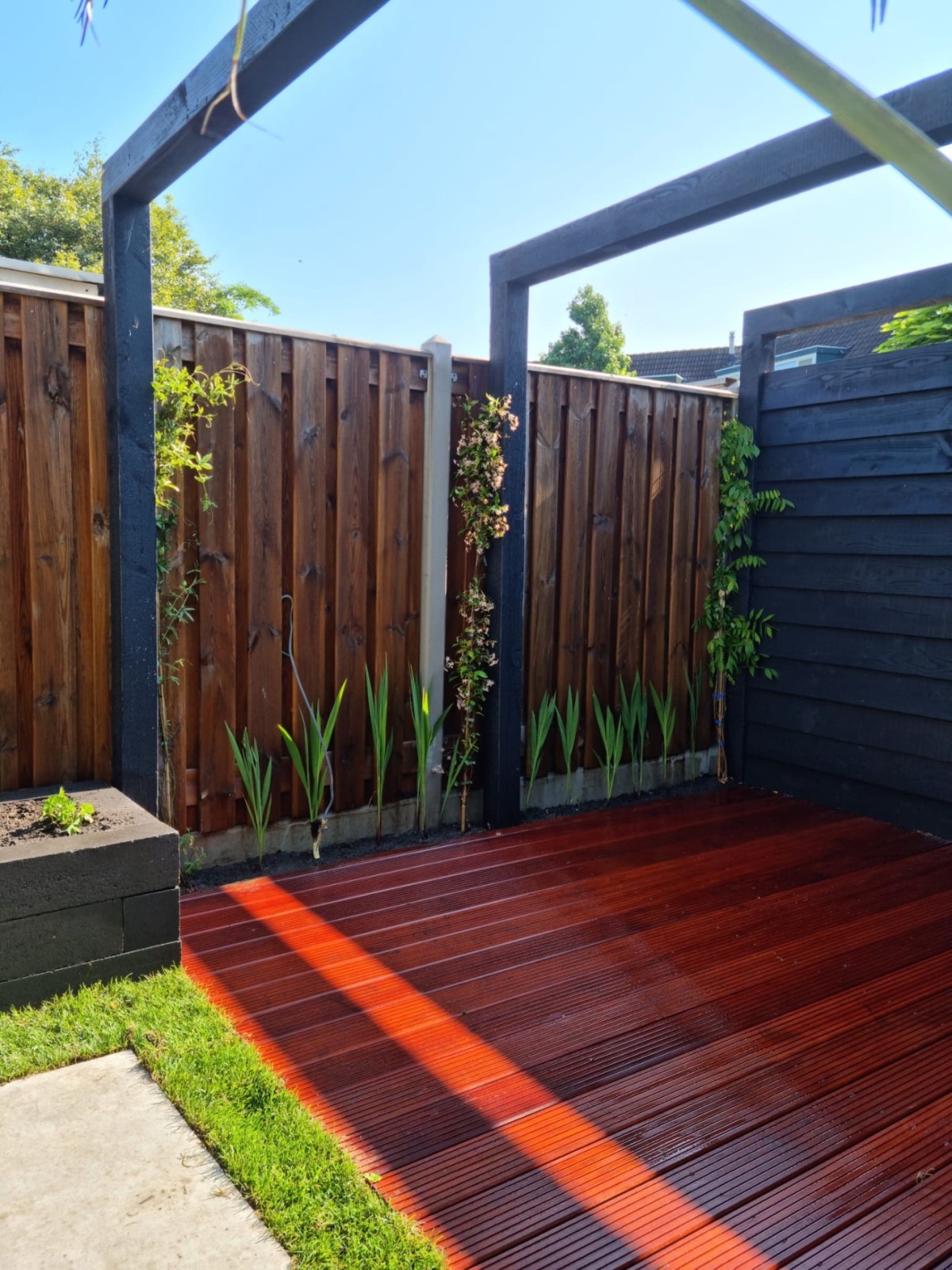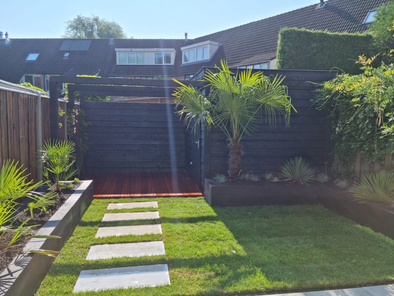 We hebben een douglasberging in ral kleur gespoten geplaats. Aan deze berging hebben we een pergola ook in de zelfde kleuren gemaakt, waardoor het ophangen van een schommel of hangmat mogelijk was. We hebben gezorgd voor afwisseling in materialen, zoals klinkers, keramische tegels, stapstenen van keramiek en hardhouten vlonders. Hierdoor blijft de tuin speels en afwisselend.