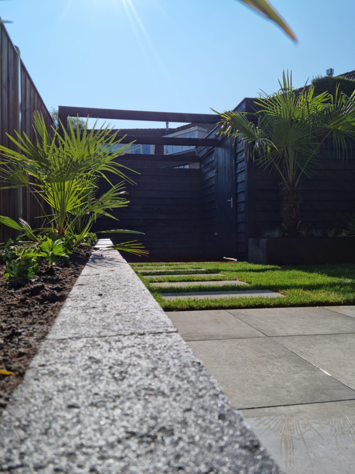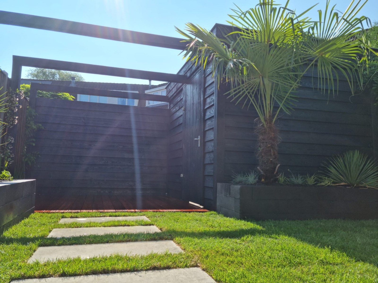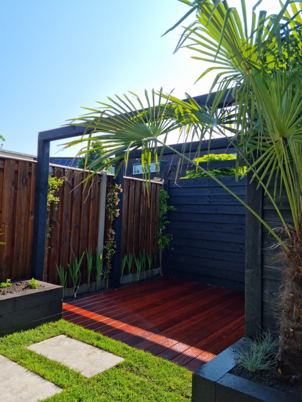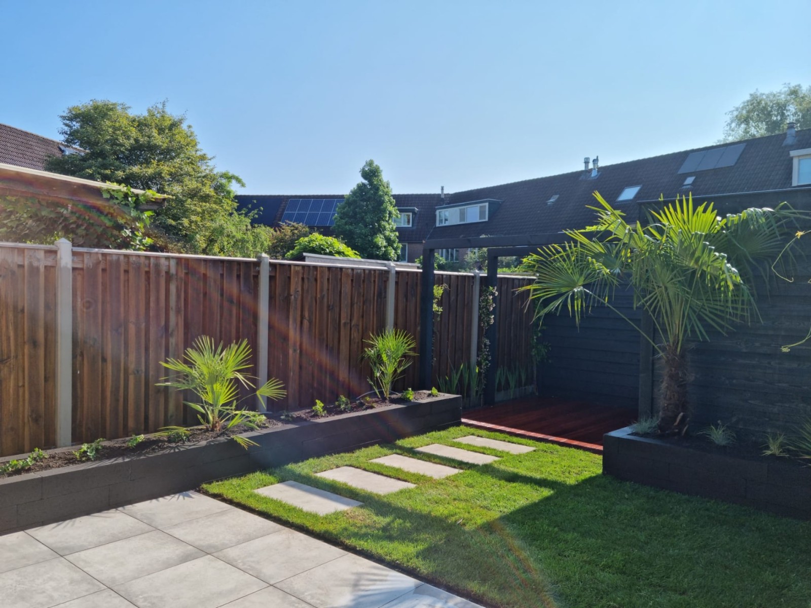We hebben een douglasberging in ral kleur gespoten geplaats. Aan deze berging hebben we een pergola ook in de zelfde kleuren gemaakt, waardoor het ophangen van een schommel of hangmat mogelijk was. We hebben gezorgd voor afwisseling in materialen, zoals klinkers, keramische tegels, stapstenen van keramiek en hardhouten vlonders. Hierdoor blijft de tuin speels en afwisselend.
