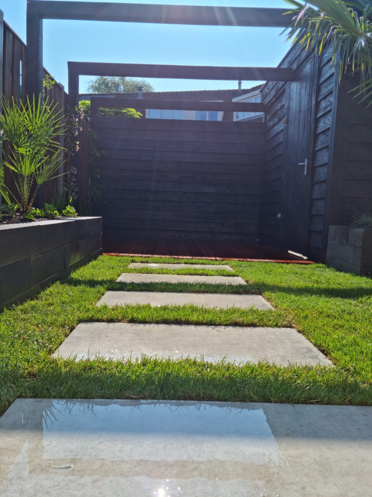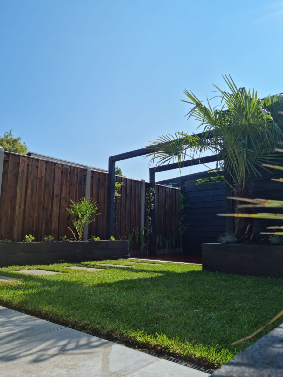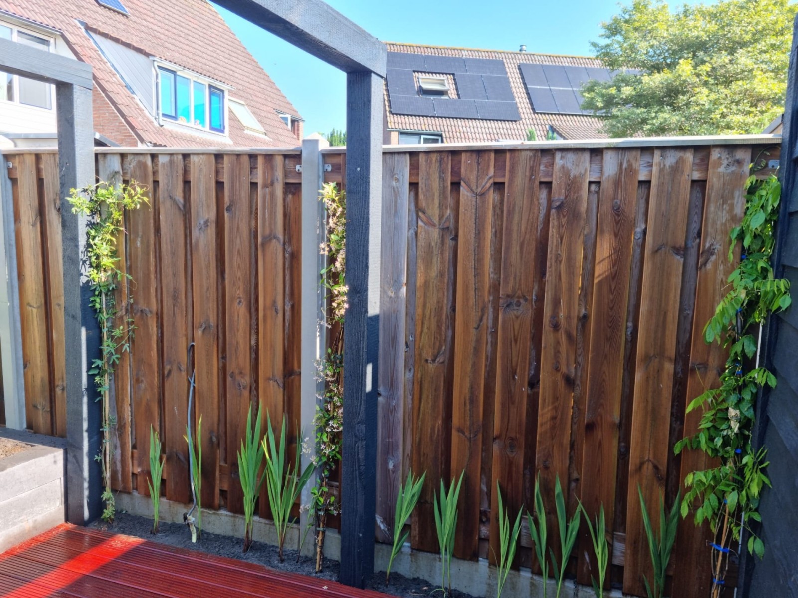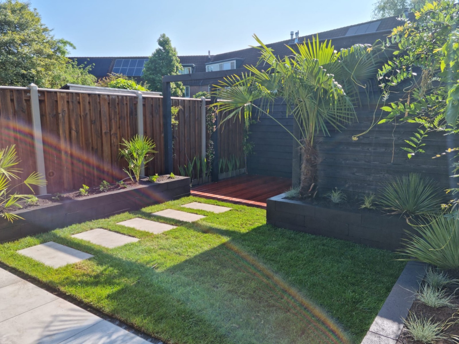 We hebben een douglasberging in ral kleur gespoten geplaats. Aan deze berging hebben we een pergola ook in de zelfde kleuren gemaakt, waardoor het ophangen van een schommel of hangmat mogelijk was. We hebben gezorgd voor afwisseling in materialen, zoals klinkers, keramische tegels, stapstenen van keramiek en hardhouten vlonders. Hierdoor blijft de tuin speels en afwisselend.