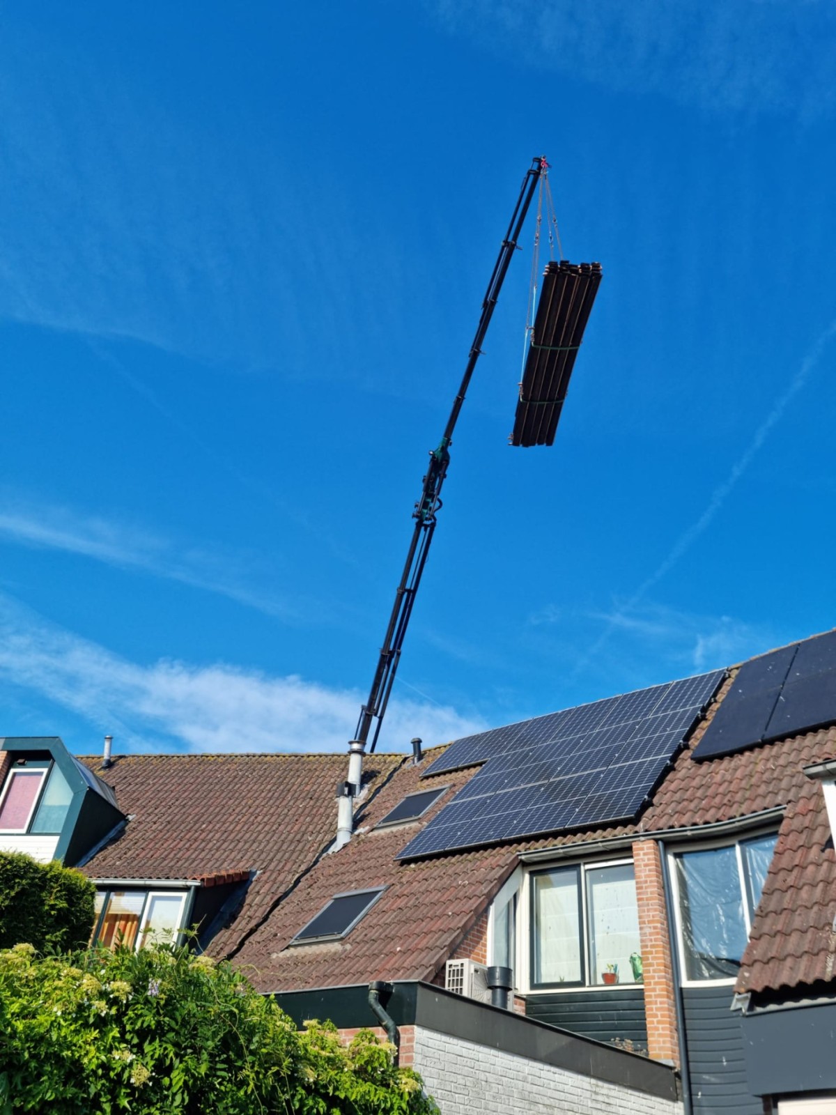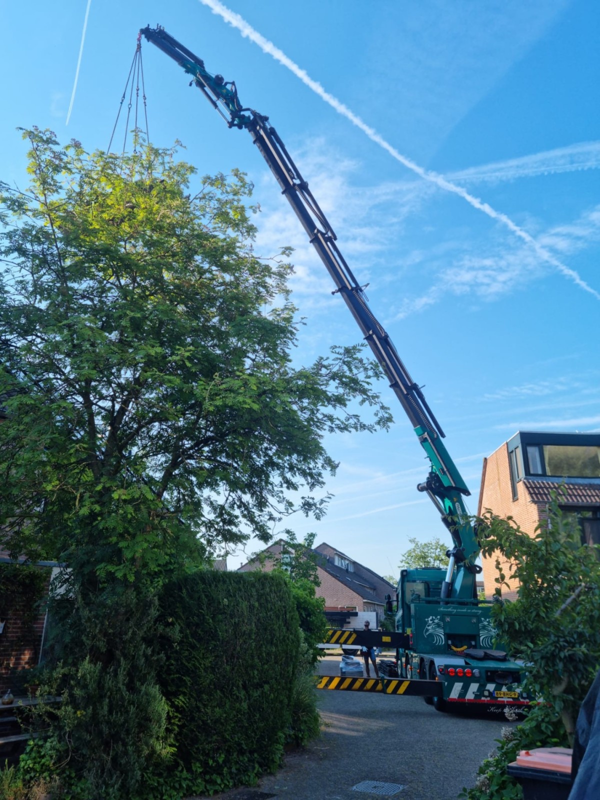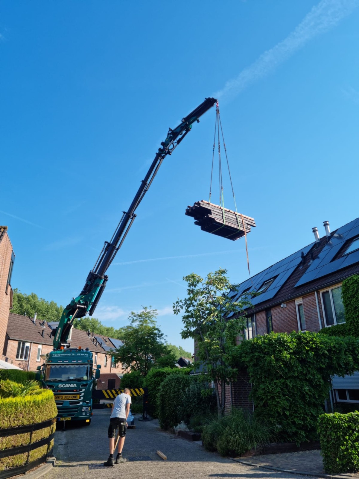 Door de hoeveelheid aan materialen en een zeer krappe steeg is er gekozen om de materialen over het huis heen te hijsen met een hijskraan.