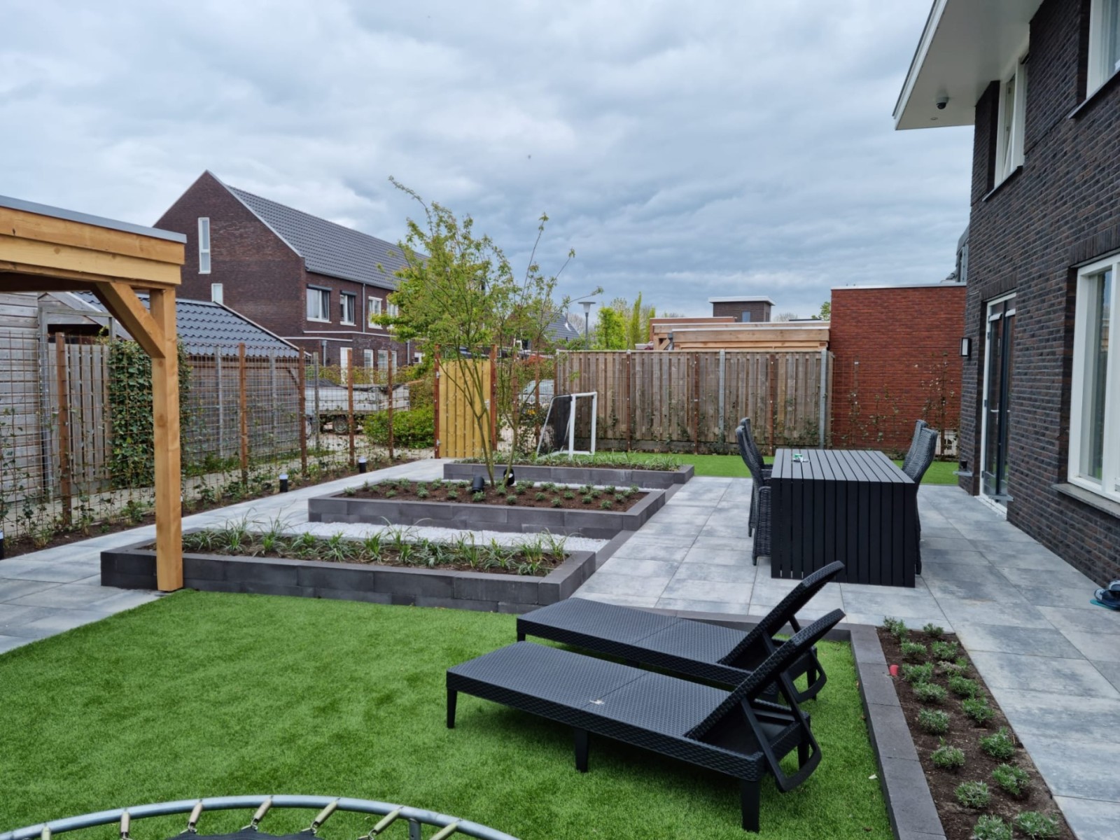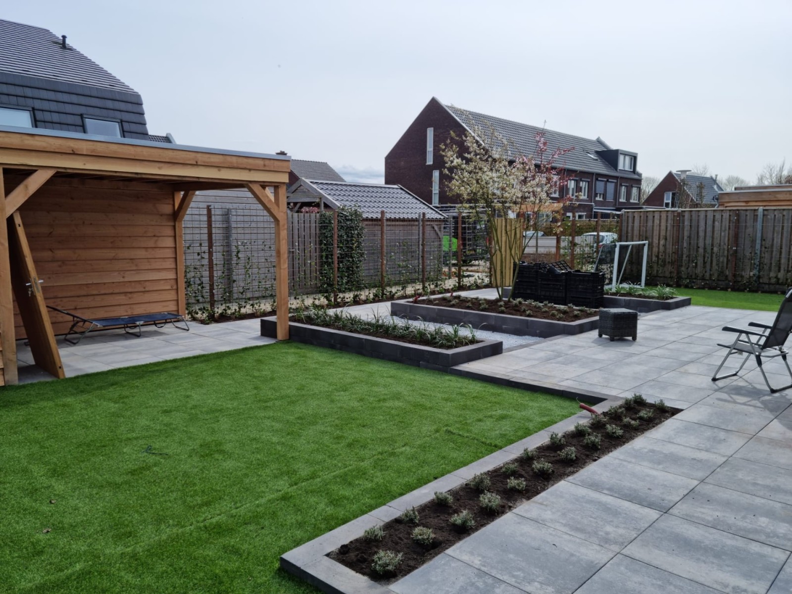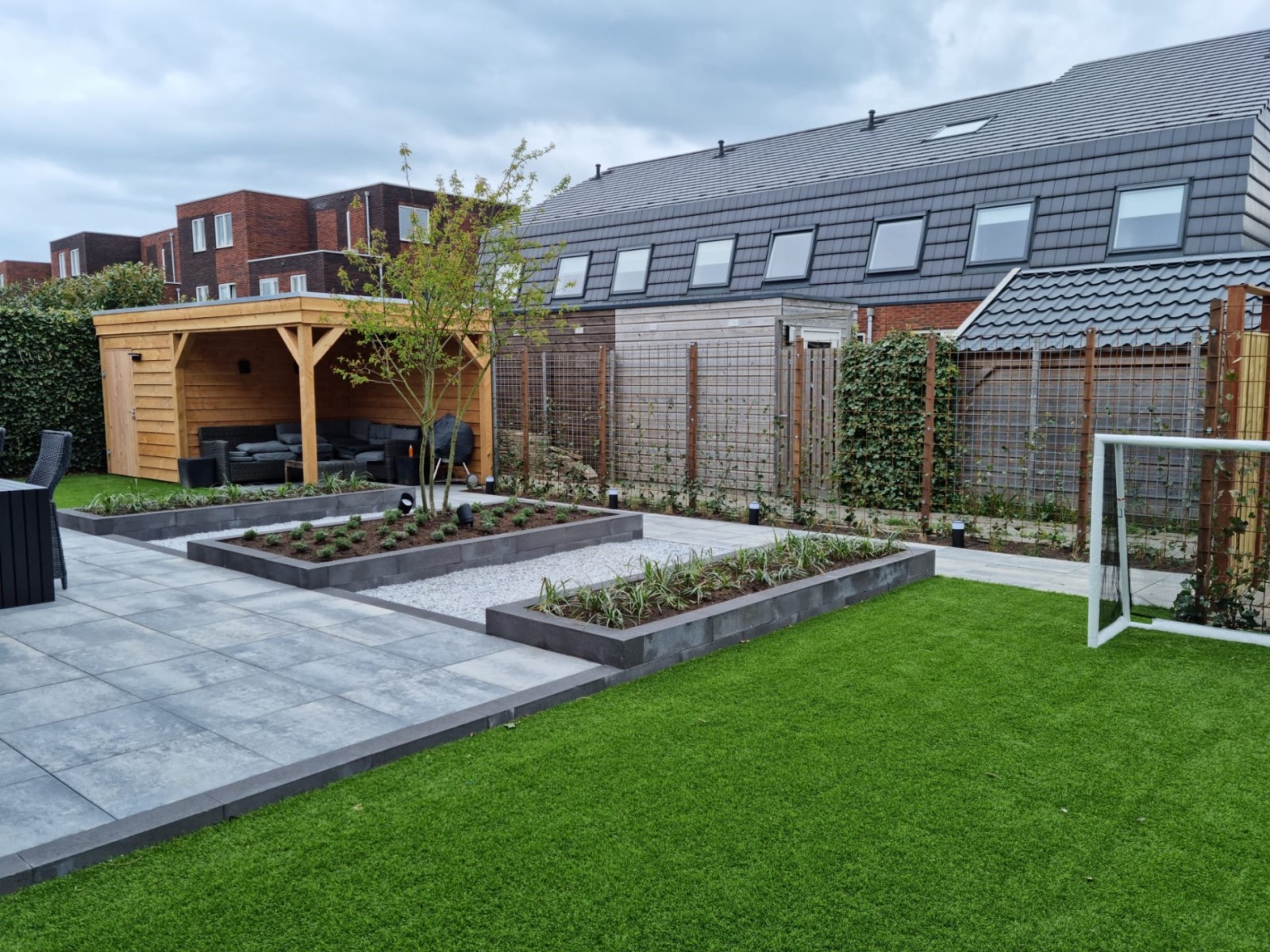 Deze moderne tuin in zeewolde vroeg om: een royaal terras, onderhoudsvriendelijke beplanting, een overkapping met berging en een speelveld voor de kinderen.