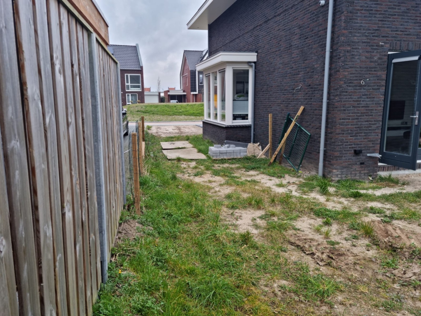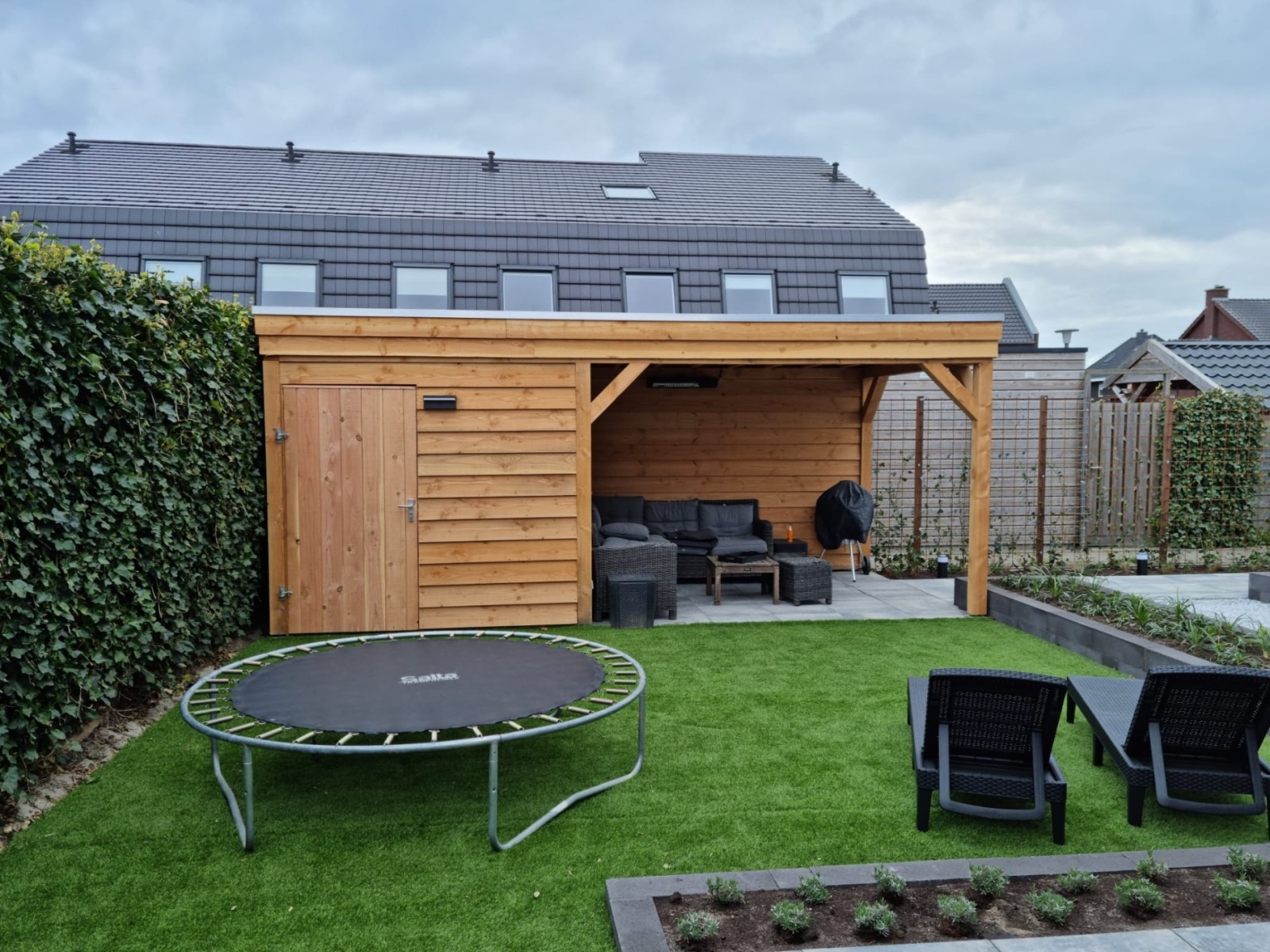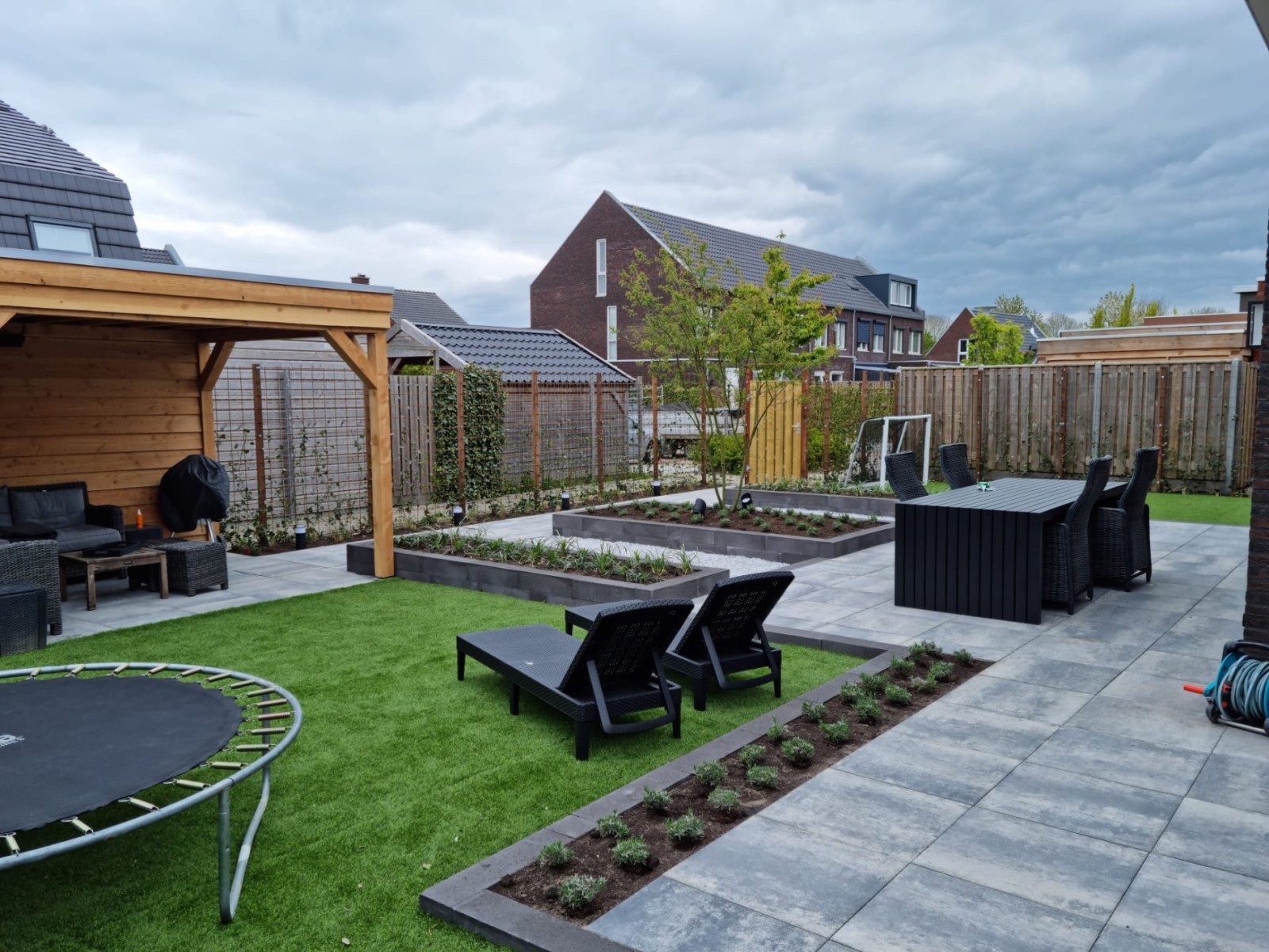 Deze moderne tuin in zeewolde vroeg om: een royaal terras, onderhoudsvriendelijke beplanting, een overkapping met berging en een speelveld voor de kinderen.