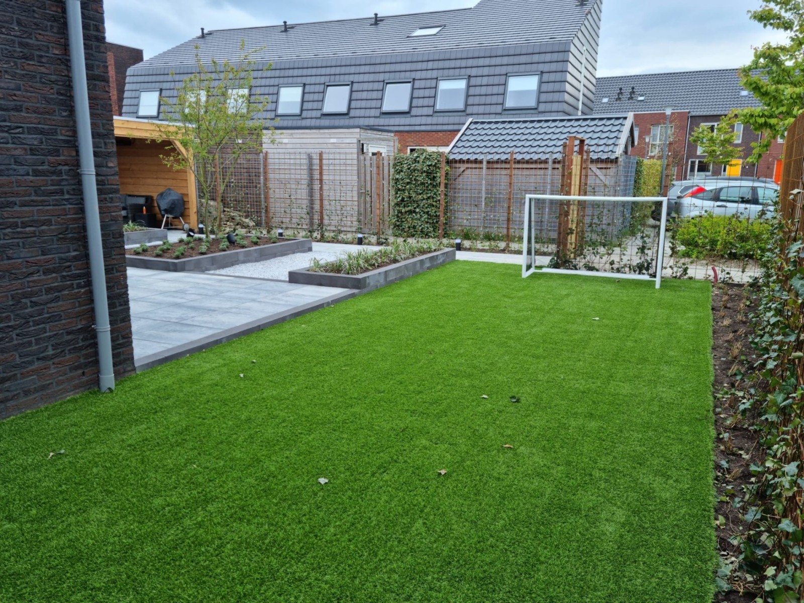 De tuin is voorzien van 2 stukken kunstgras, waarop de kinderen heerlijk kunnen spelen en voetballen. Er is zelfs genoeg ruimte voor een zwembad.