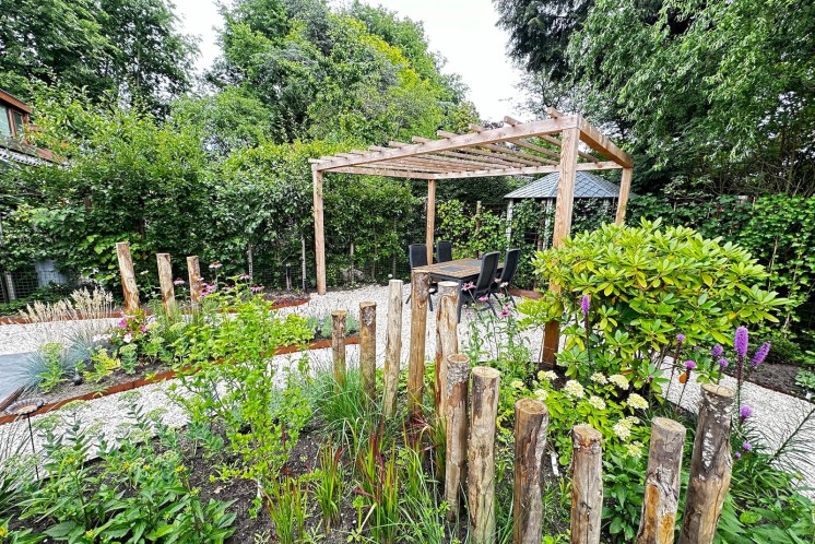 Tuinaanleg Leerdam, een bloementuin met bijen en vlinder planten en een kastanje pergola